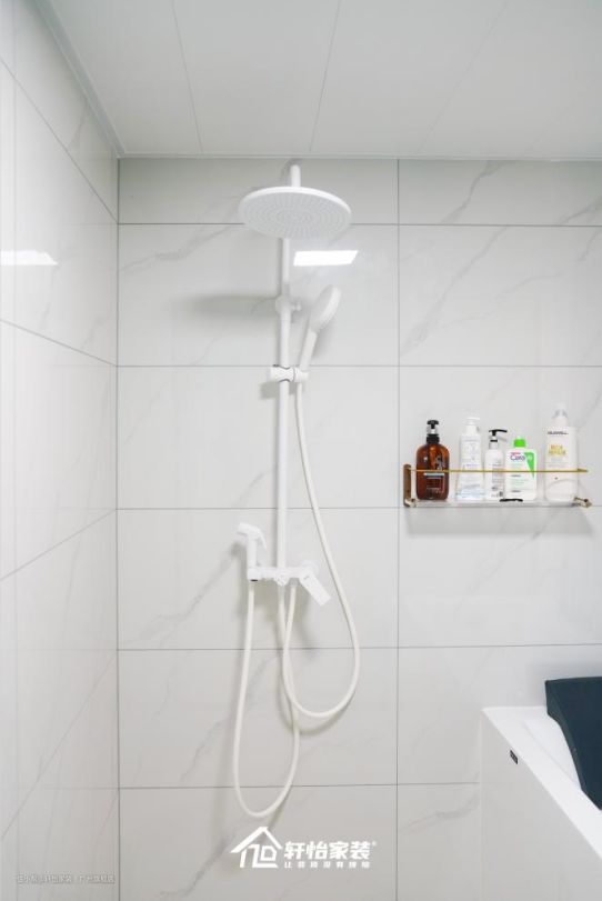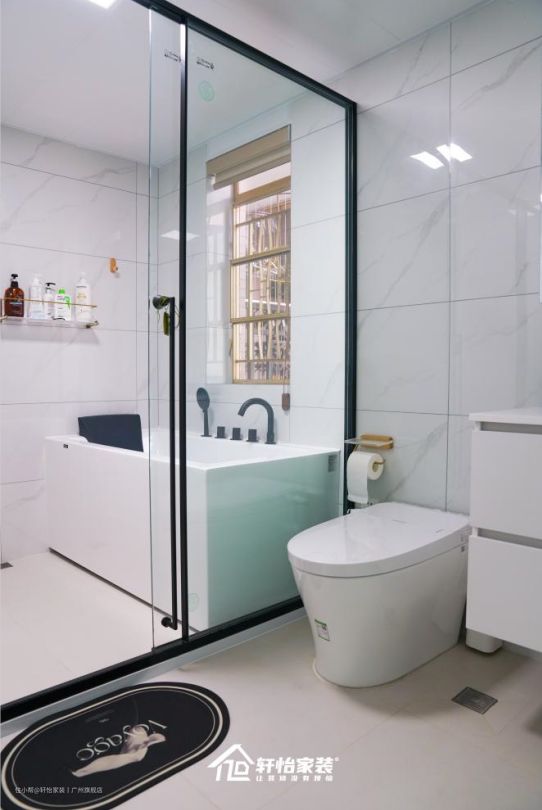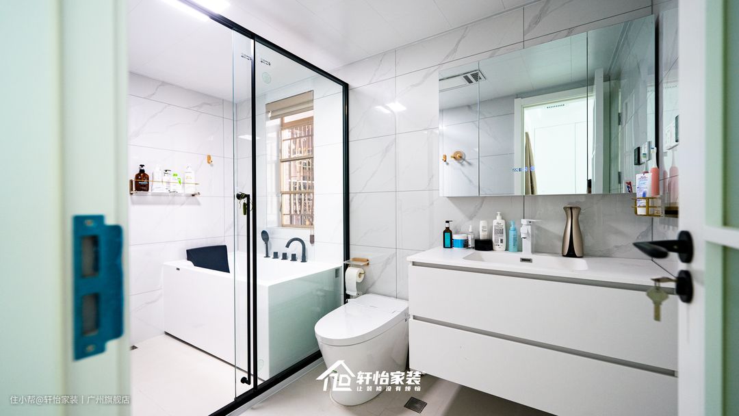 湿区使用长虹玻璃打造了一个大面积的淋浴房,加上铝合金开窗,有效改善了淋浴房的采光和通风。其次根据业主需求,布置了一个小型浴缸,保留淋浴花洒套装设置,让业主可根据自身需求使用淋浴房,真的贴心又便捷。