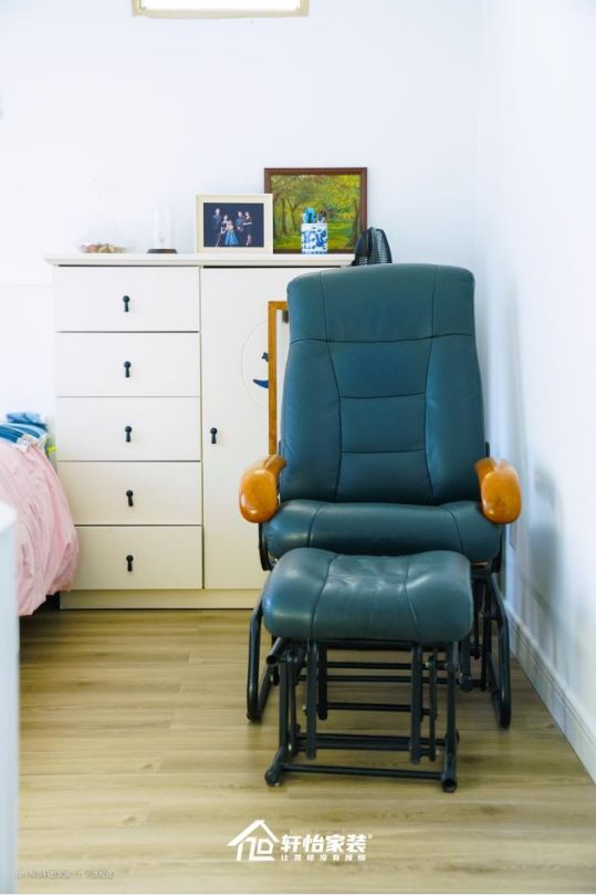 左右两边的定制床头柜,分别以拉门与抽拉柜设计,收纳储物功能非常丰富,其中顶面同样可以作为摆放相框、画框等物件,展示功能再次突显。 为了方便长辈休息,在设计师的贴心安排下,布置了一台墨绿色可伸缩的休息椅,平时作用休息放松也是在适合不过了。