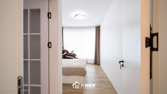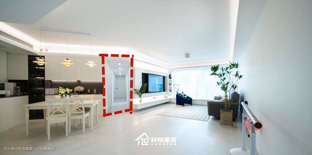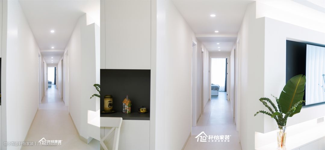 地面通铺米白色瓷砖搭配白墙的素雅,尽头以主卧门截止,深长直达4米多,大气氛围感直接拉满。白色门套的选择,让空间轻盈感得到最大化,搭配天花多点式光源设计,时尚通透。