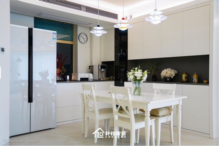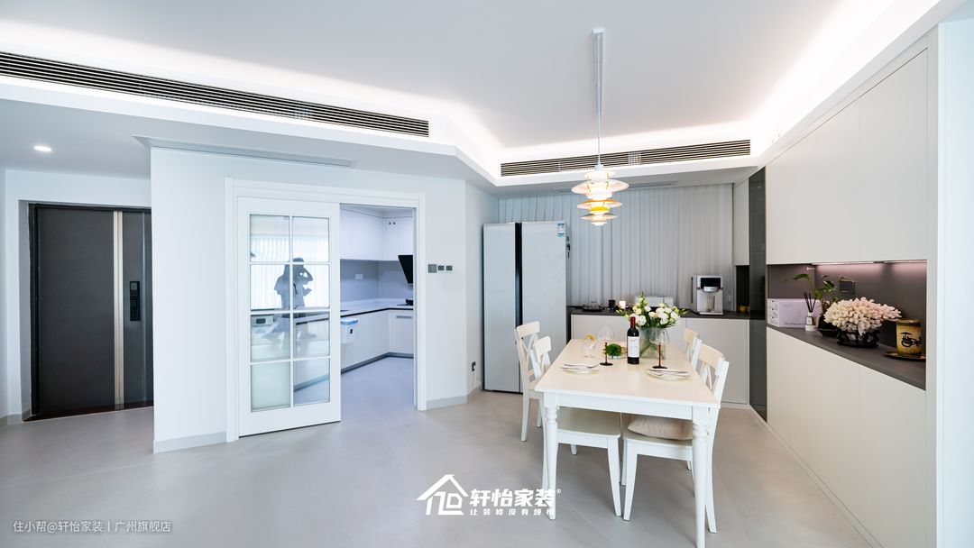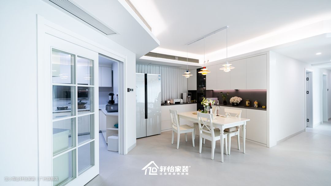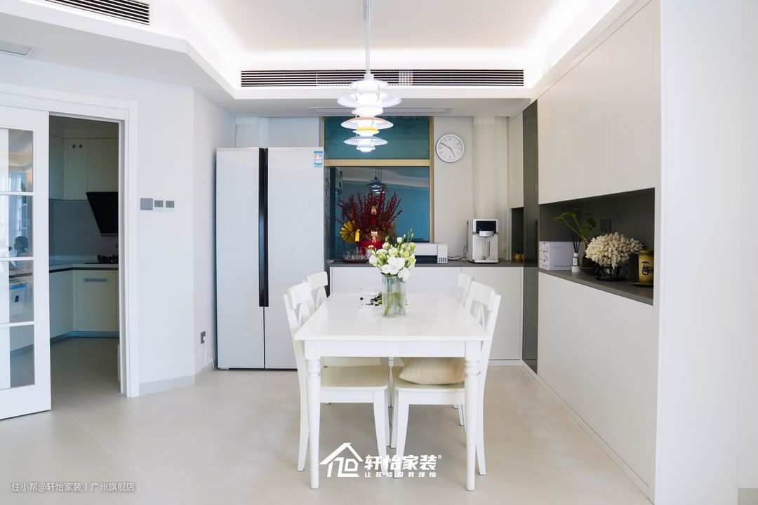入户左侧过来则是餐厅,从餐边柜到木质餐桌椅,再到冰箱、岛台,都是以白色系为主,整体营造了一个明亮干净的用餐环境。