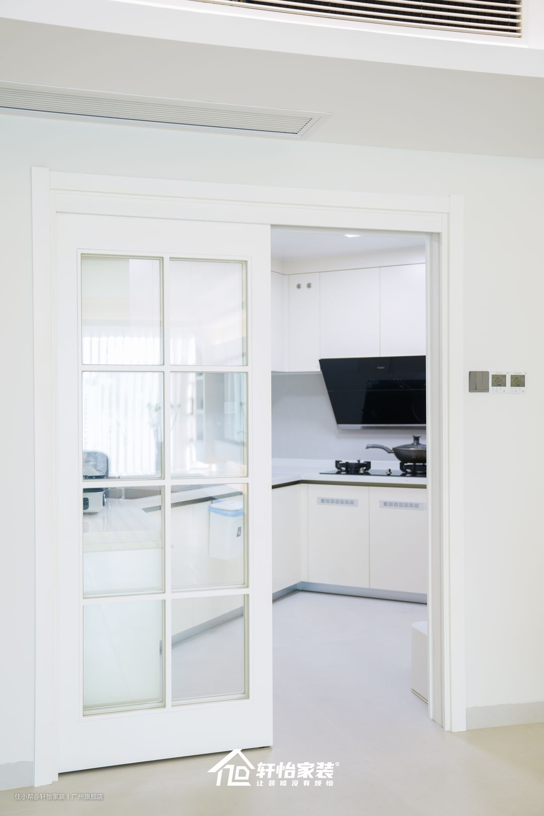 厨房重开门后,直接出门就是餐厅,生活动线缩短,更加便捷顺畅。玻璃格子推拉门设计,方便客厅光源穿透,增加厨房采光,整体门面设计感拉满。