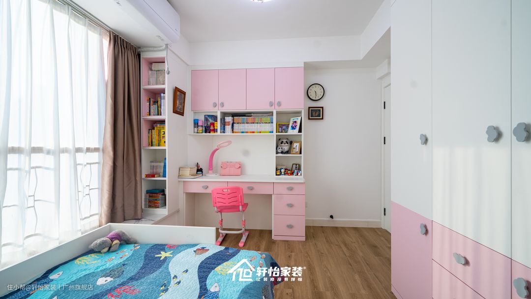 再次采用粉白撞色设计的收纳柜+书桌一体化设计,实用性与高颜值兼具,开放收纳+封闭收纳组合布局,多元收纳设计满足小孩的储物需求。