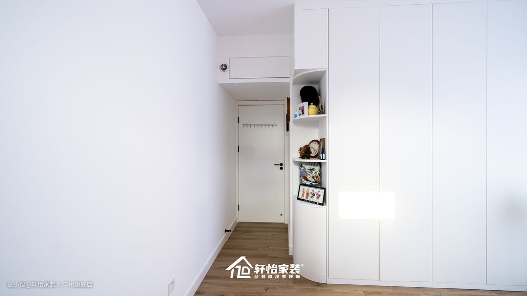 长辈房的设计,真的是处处彰显设计师的贴心之作,半圆弧的整面到顶衣柜设计,不仅有效避免日常磕碰的安全问题,还能避免日常卫生死角的打扫问题。开放格+暗门设计,收纳与展示功能兼备,多元储物空间设计十分贴合生活需求。