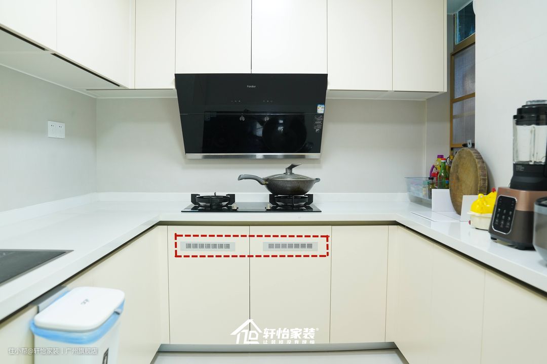 嵌入式煤气炉设计与智能抽烟机的布局,再配上下地柜超贴心的燃气通风口,保证厨房重地的油烟味不至于到处流通,加上左边的玻璃门开窗,不管是采光还是通风,都是一个棒字了得。