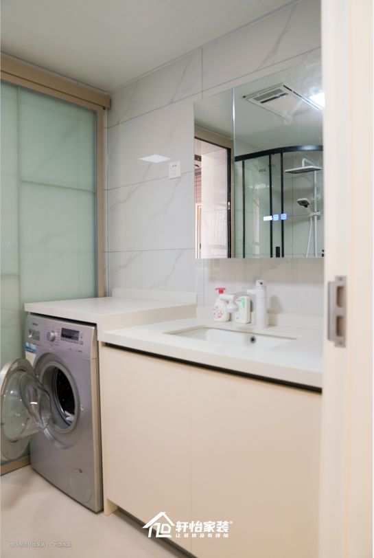 洗衣机在洗手台的延伸位做了嵌入式处理,让公卫的使用空间更加合理化。收纳洗手台+镜面柜的设计,收纳与日常整理妆容都非常便捷,为业主打造了一个实用整洁的卫浴空间。