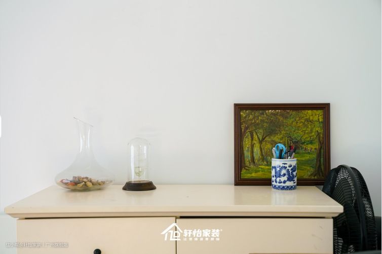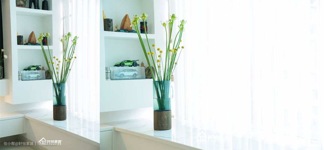 从电视背景墙地柜延伸到大飘窗,设计师做了地台和开放收纳格设计,与飘窗同高的三层开放收纳格,是作为家里陈列品的主要展示空间,与飘窗地台上摆放的大瓶插花相辅相成,在白色窗纱的映衬下,不经意间落落大方,让人有种此生长居于此的感觉。