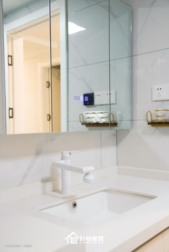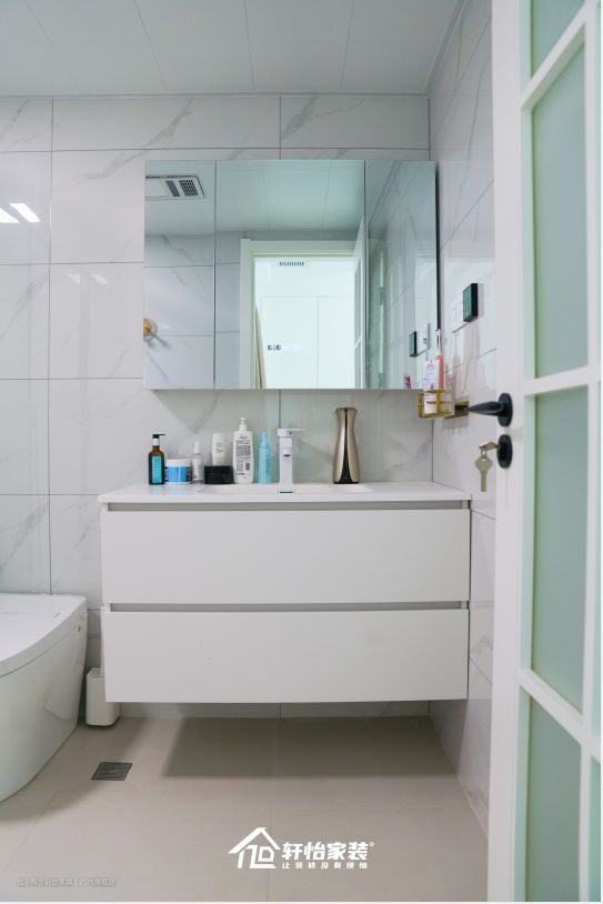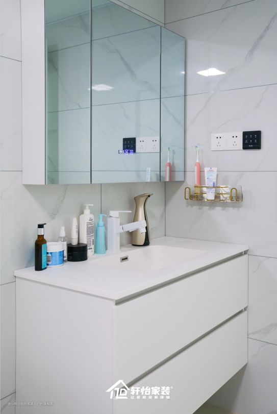 采用75CM高设计的白色洗手台+镜面柜布局,再搭配墙边的小型置物架,大小物件一并收纳,让日常洗漱用品无处可逃,让干区看起来更加干净卫生。