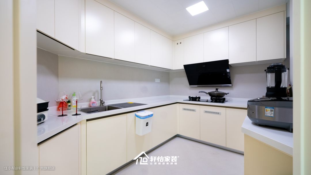 厨房整体设计以米黄色为主,根据厨房的户型结构,为了保证厨房空间的有效利用,设计师打造了一个“U”型操作台,洗切煮更加便利,提高了妈妈的烹饪体验感。 ♥米黄色的上下橱柜与灰白色的地砖形成鲜明的对比,简约的设计理念再次凸显,为业主打造了一个干净整洁的厨房空间。上下吊柜与餐边柜设计统一,都是暗门设计作为封闭收纳空间,让厨房看起来更加干净卫生。