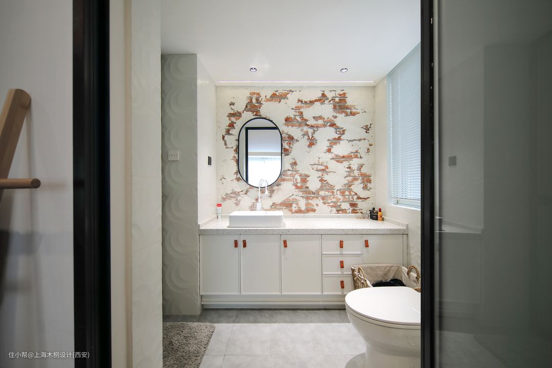 主卫洗手台墙面也使用了做旧红砖,与白色相得益彰,水波纹瓷砖营造出清凉的透气感,通铺淋浴区,壁龛也做到严丝合缝。归沐的时刻,最为疗愈。