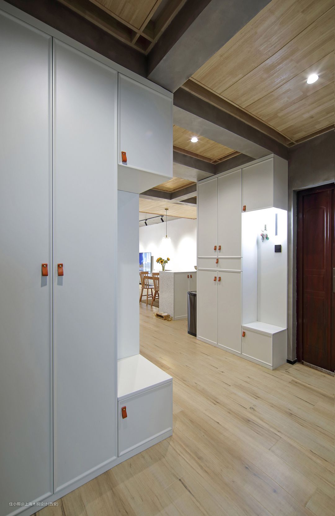 公共区域保留了原始裸顶,餐厅和西厨区域增加了吊顶装饰。 木框架的结构吊顶工艺: 1、用龙骨制作基础吊顶结构; 2、按照尺寸将实木指接板进行裁切,修整毛刺后,在板材表面涂刷一层木质水性清漆,对面层进行保护; 3、等板材干燥后,按照设计尺寸及位置进行封板安装。