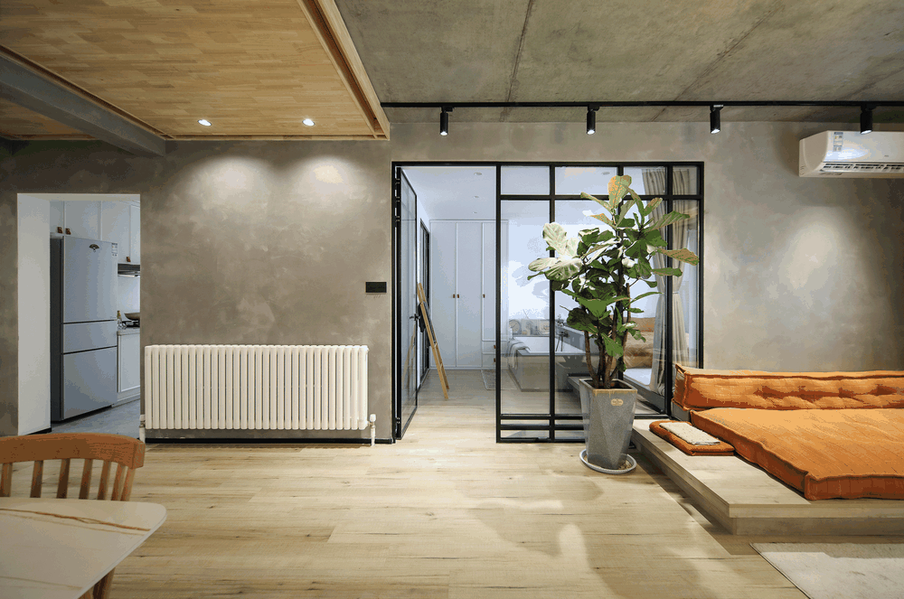 有质感的轻工业风,粗犷硬朗之余,用暖色与原木调和,热情的红色、橙色,温馨却不耀目。依据委托人喜好,将客厅与主卧作为连接的起居空间,“以放松自适的姿态呆着”是家的本来面目。