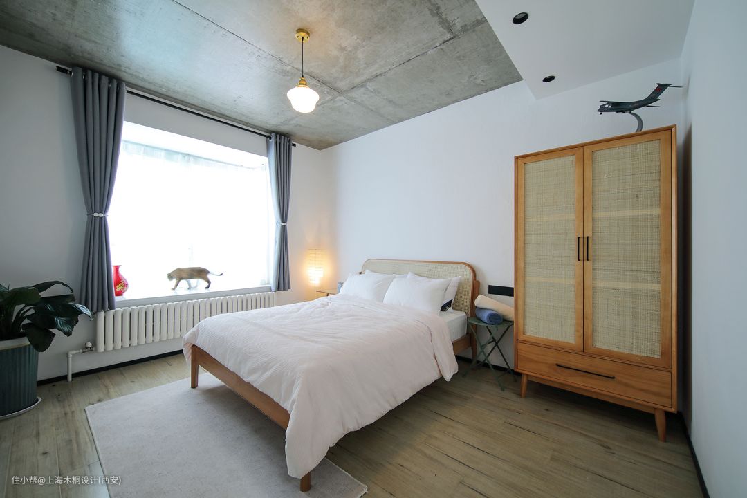 客卧现在是喵酱最喜欢玩耍的地方,舒缓清新的氛围,藤编家具增加了一份亲自然性,和小生灵一样灵动。 与客厅一样,客卧也保留了原始的清水混凝土顶面,它的粗犷与细腻的白色石膏顶面对比之下形成一种特殊的美感。