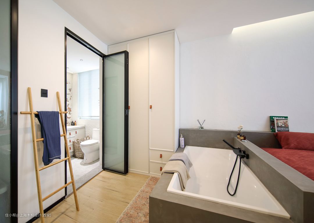 屋主从设计时就希望空间尽量开放,不考虑会客。于是我们把客卧作为联动的空间,客厅地台延续至主卧,一体砌筑的地台+浴缸构成主卧的主要功能区,浴缸的位置和水电、防水工艺经过反复讨论验证,最终得以实施,实现了屋主“洗完澡裹着浴巾直接跳上床”的描述。