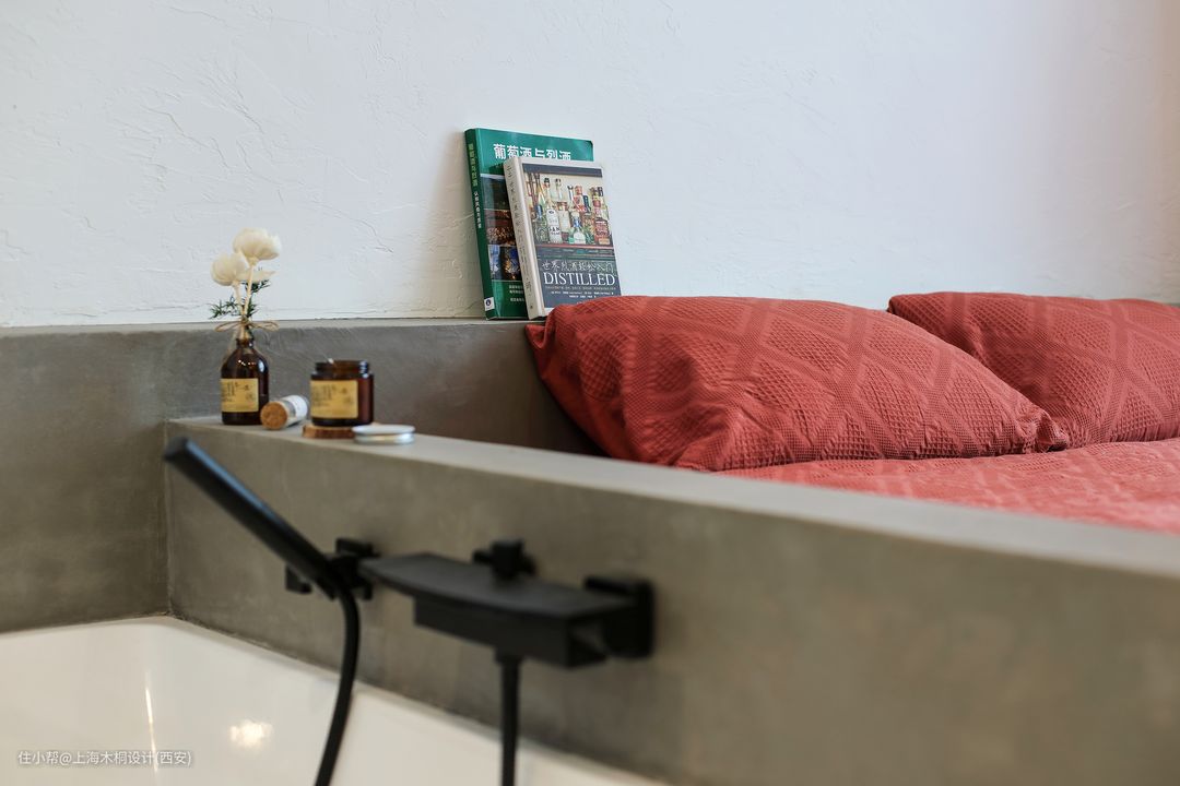 两人两猫,目前是“四口之家”,从设计到乔迁,历时两年多。因为装修到一半,屋主开酒吧去了,于是我们又为他们设计的了酒吧。 本案极大程度依照了生活习惯,他们不喜传统户型中“一个功能一个空间”,我们将主卧和客厅打通形成“起居空间”。屋主是跨国组合,男主是外国人,职业调酒师,西餐烹饪也是日常,他们还非常明确的表达了要在卧室放浴缸。设计调研时,屋主对粗糙有肌理感的装饰面表达了极大的喜欢,旧红砖、水泥漆成为空间的主色调,辅以木色和白色,注入温馨的调和。 屋主入住了近两个月才进行拍摄,当天他们一人靠在阳台,一人窝在沙发里,电视机播放着美食节目,时而聊天,时而各自打手游。我们看到了他们最舒服的姿势,在生活中的样子。 房间中使用了做旧红砖墙面,设计时红砖还并没有出圈。经过油工师傅现场的指导教学后,设计师、项目经理、设计助理共同参与完成。我们的油工形容:整面墙看上去“像风吹过的感觉”。