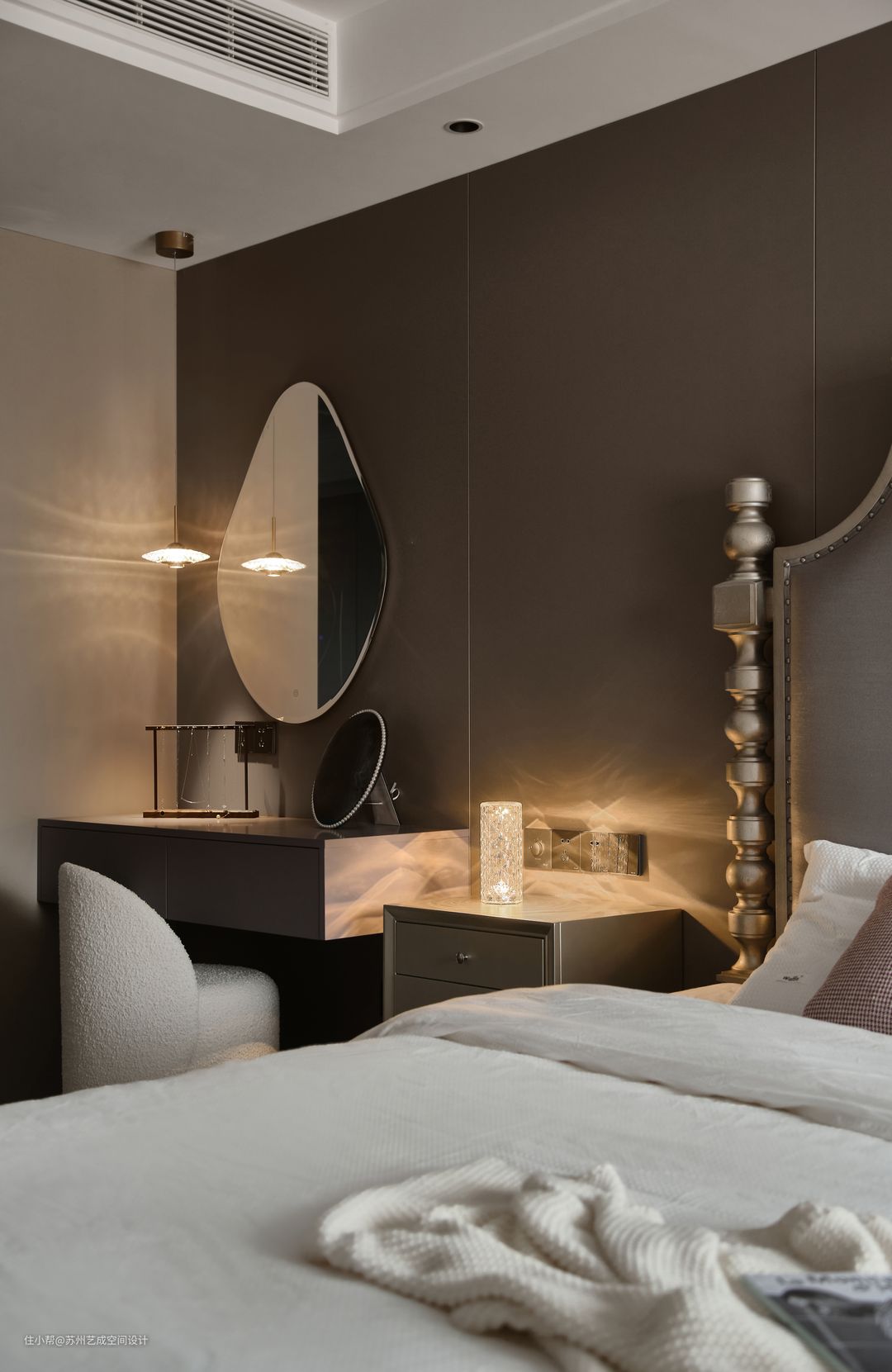 卧室空间结合女主人的个人喜好,在风格上我们延续了客厅的简约效果,搭配了客人喜欢的美克的床具。