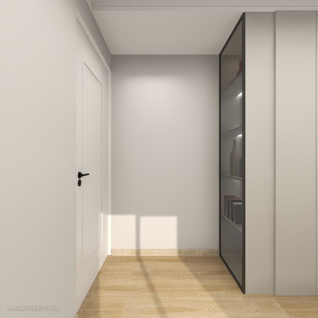 主卧定制了通顶的L型衣柜,一进门处的柜体用灰色的玻璃做封板,内部嵌入了装饰灯带,防尘的同时还兼做展示柜,让人看到就很有好心情。