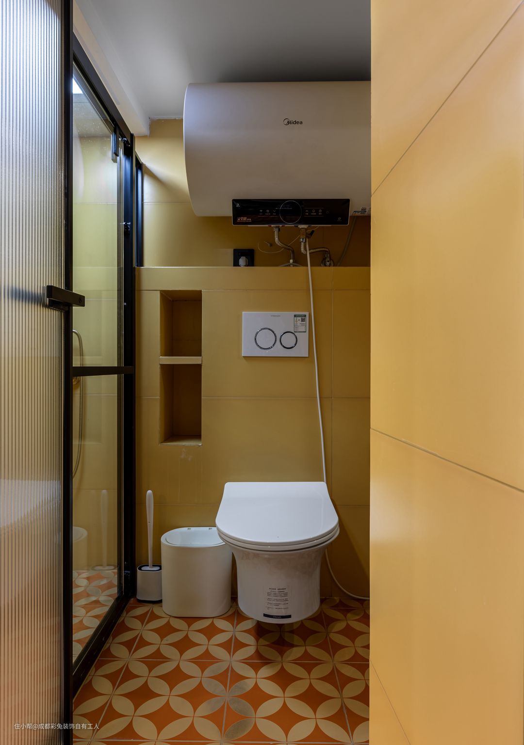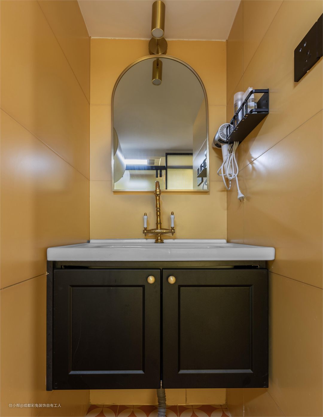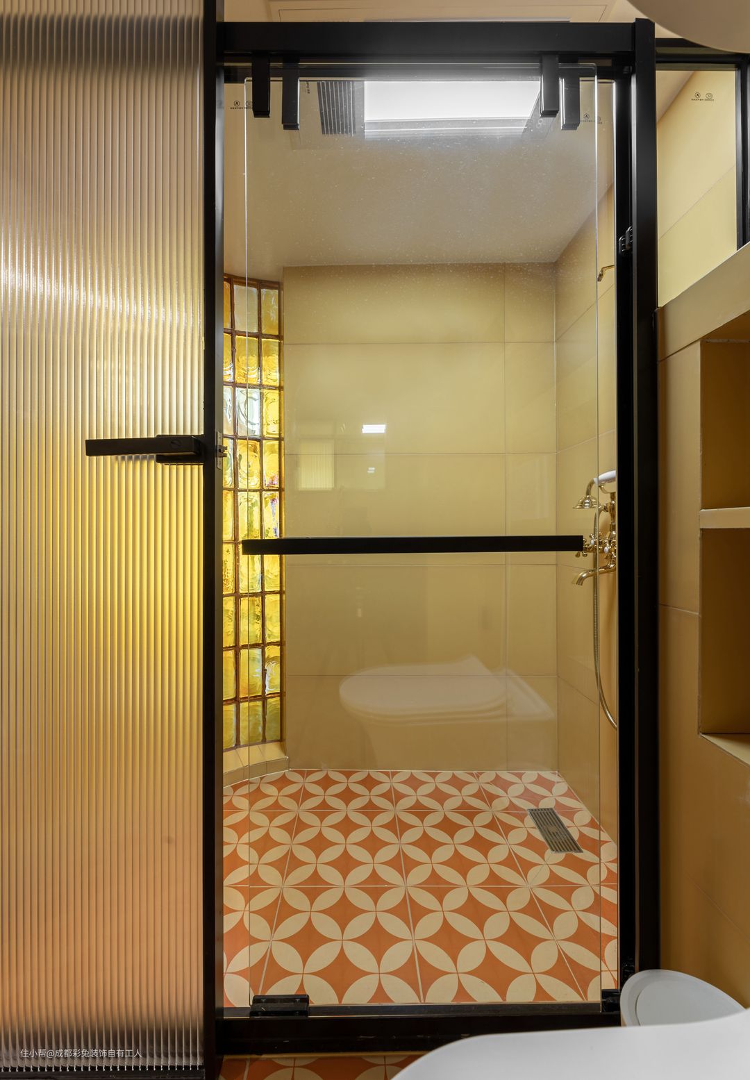 长虹玻璃、橘色满天星小砖延续入户的张扬,色彩、风格统一,加上功能性上的一系列细节,使得现代与华贵融合,毕竟给猫猫洗澡也要有仪式感。