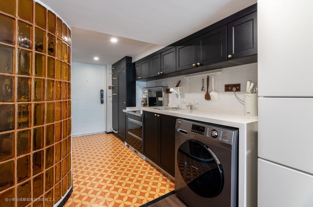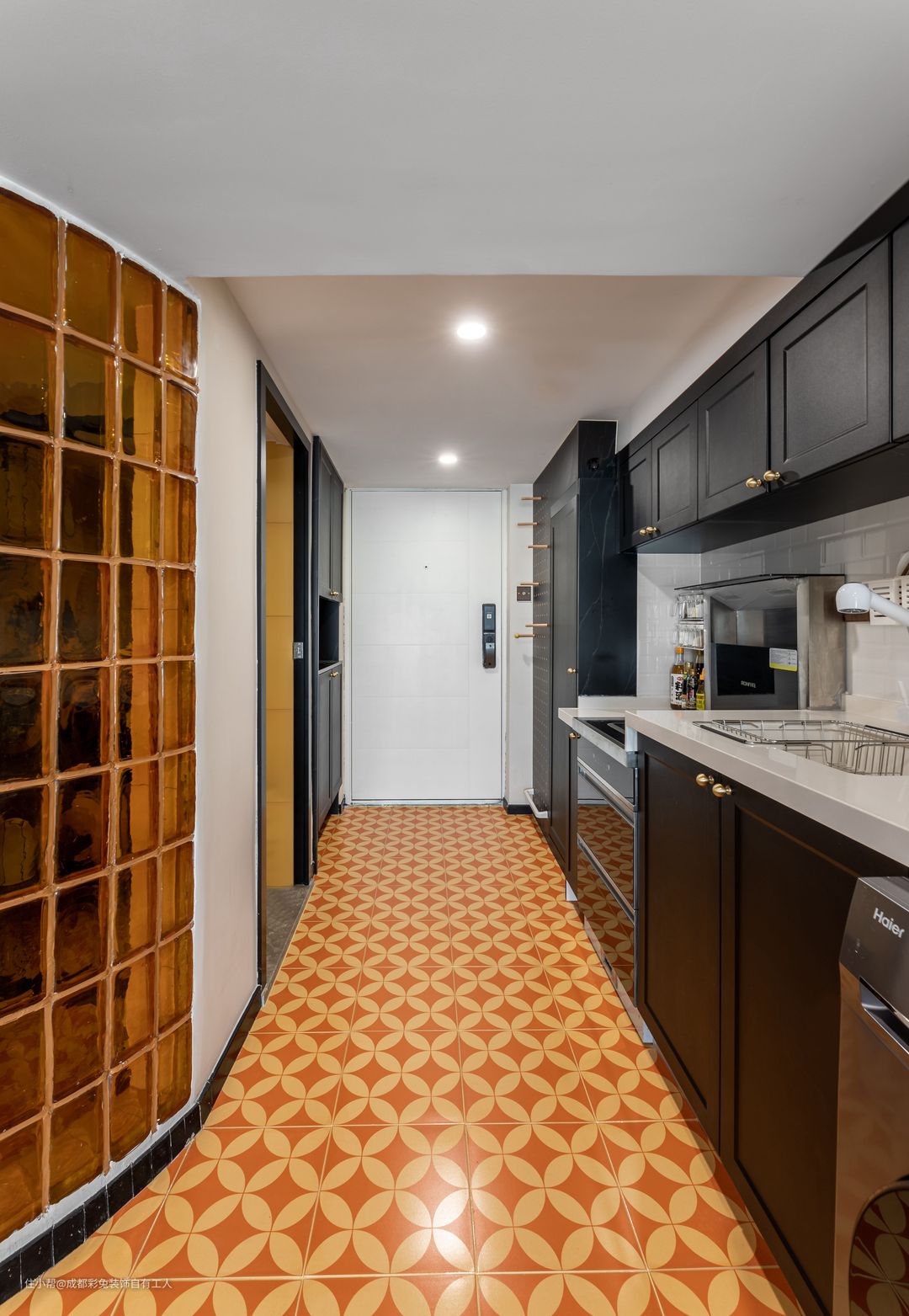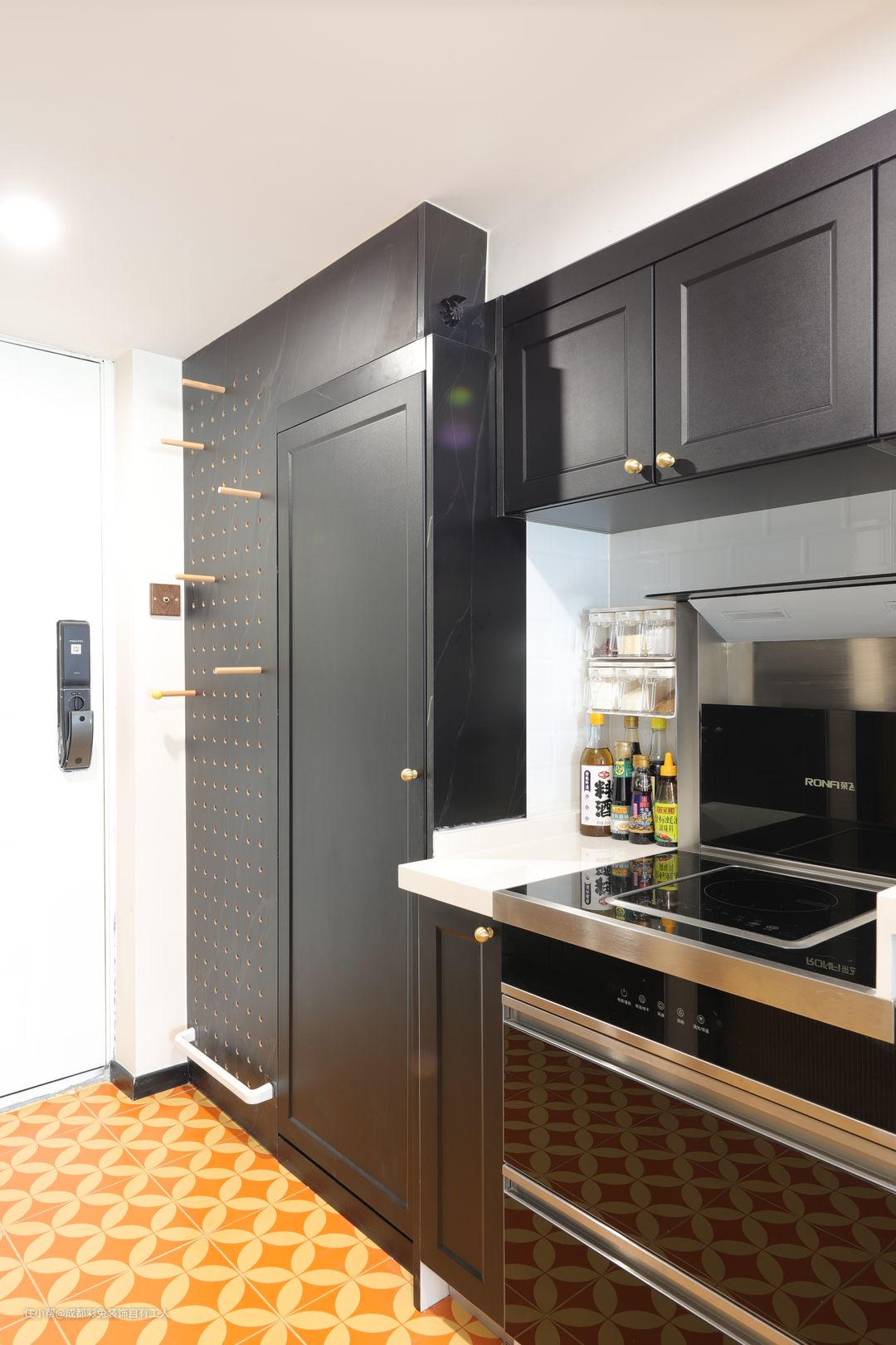 橘色糖果般的钻石玻璃,与以黑白主色的厨房相对,分散了单调感,色彩间的冲突让原本狭小的区域有了特殊美感。