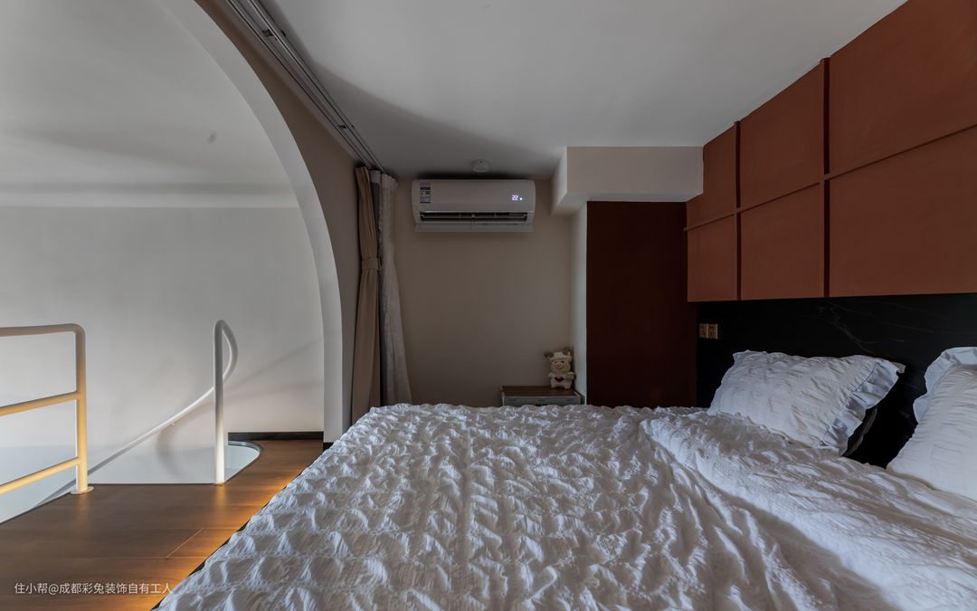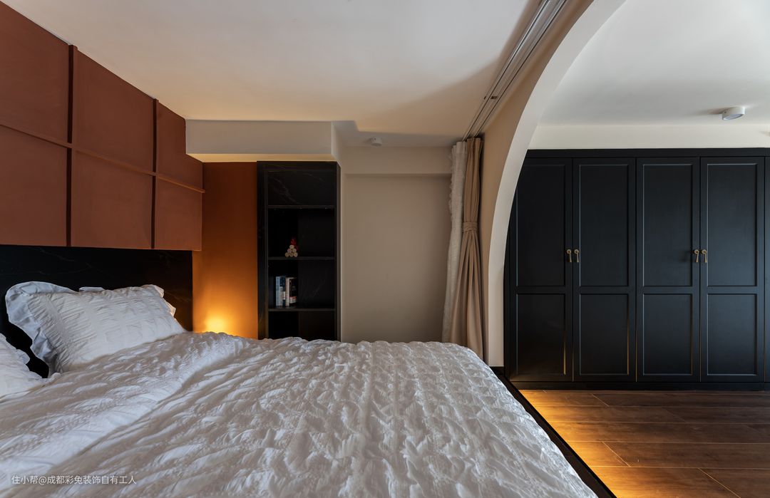 床头奶油蘑菇台灯与床尾的内嵌式灯带,可在任何情景下提供安静又让人安心的辅助照明,同时金黄色的光线和楼下亮橘色钻石玻璃、瓷砖相呼应,仿若上下两层统一,彰显屋主个性的同时富有艺术感。