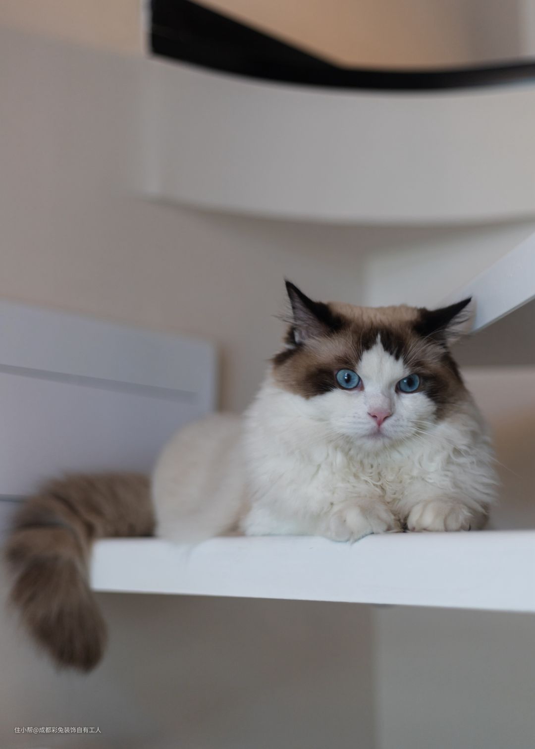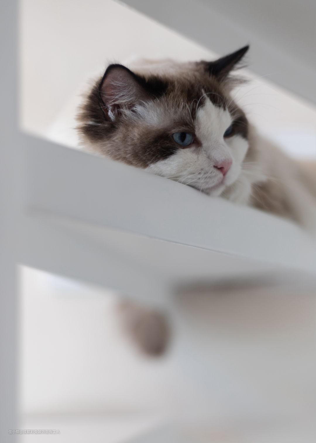 本案例是为一位95后女性设计师打造,她为某服装品牌提供设计方案,长期的创作与思考,令这位美女的审美高于常人,看法更加的现代与前卫,对色彩的敏感度也更高,基于以上,我们为其量身定制了一套装修方案,风格主体为现代,同时混搭意式与日式,整体上,布局和色彩摒弃传统的装修方式,表达出女主人不被定义的生活态度。 另一位小主人kiki,已经陪伴了女主人两年的布偶猫,“表示”自己需要一个猫爬架,以及通往二楼的楼梯也是自己的专属地盘。