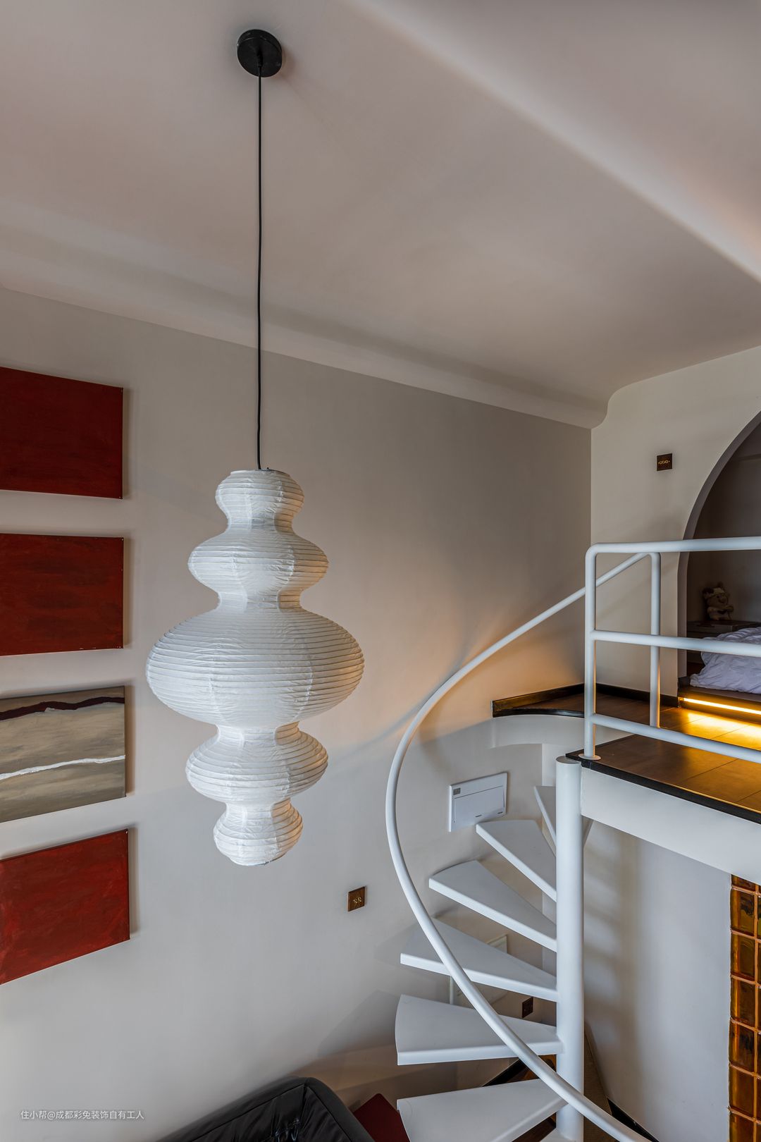 通往二楼的旋转式白色楼梯,整体弧形设计,利用垂直空间,打造空间立体感,有客人来访时能更好的保护女主人的隐私。