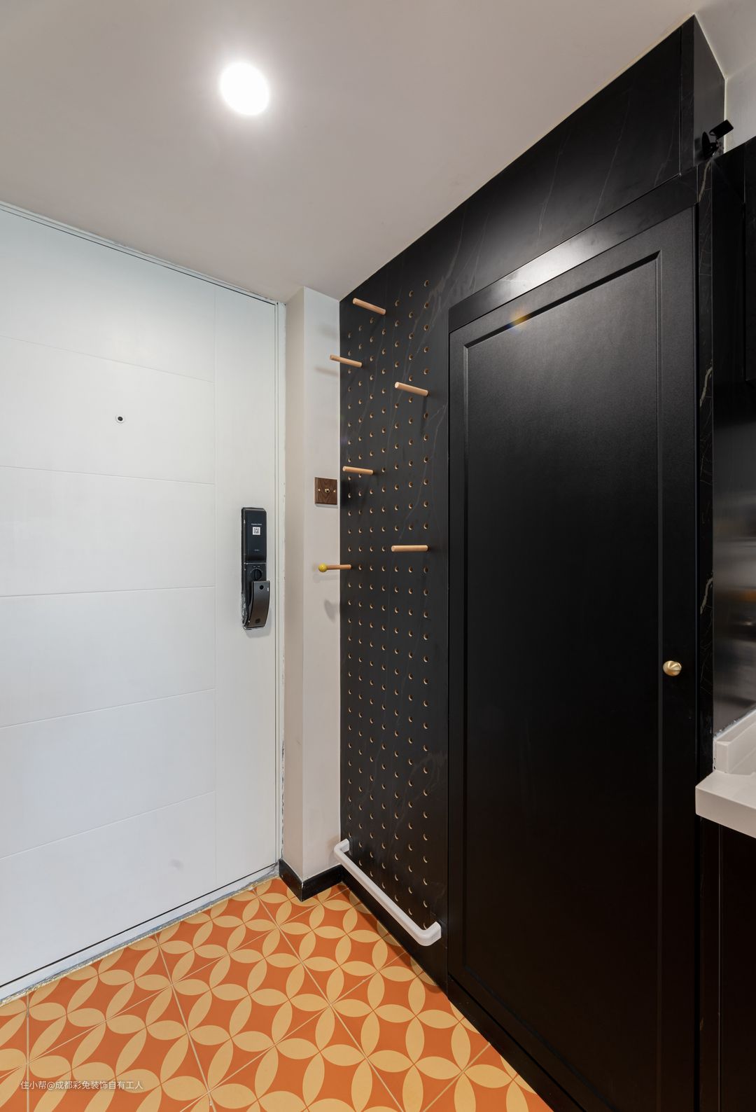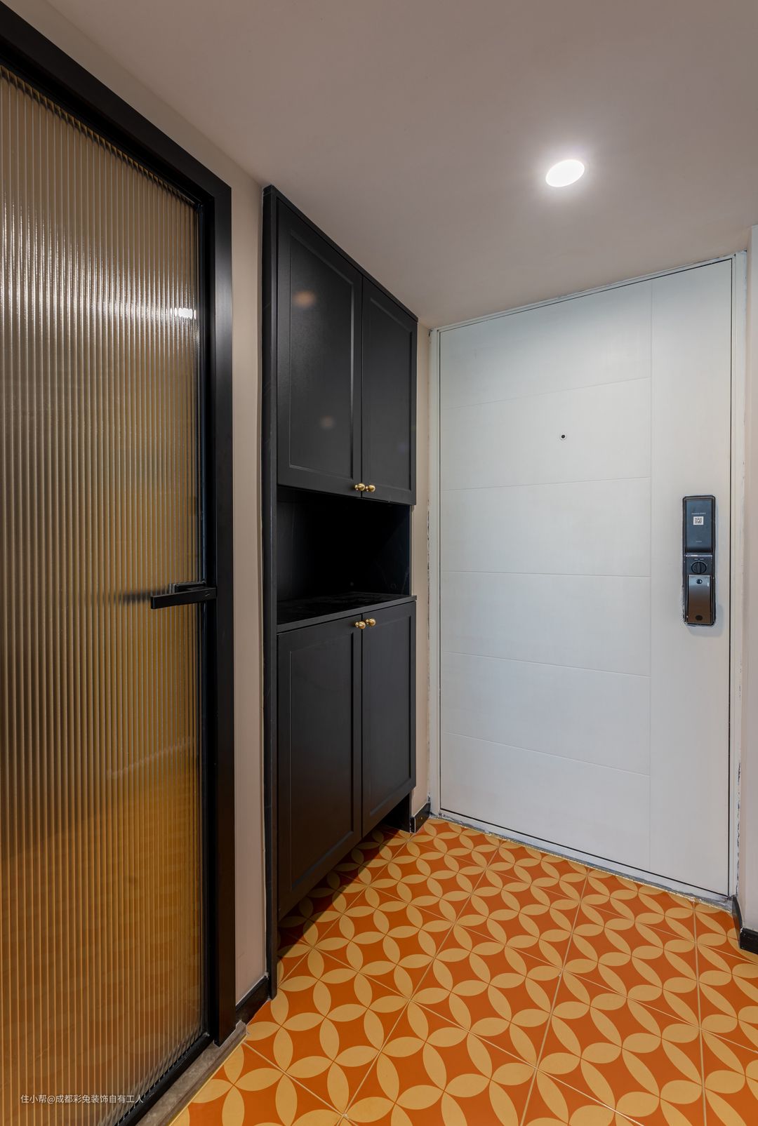 入户的第一眼,橘色满天星瓷砖引人入胜,利用色块的凸显从视觉上完全打开了通往客厅区域的通道,空间层次在这种色彩反差感中应运而生。