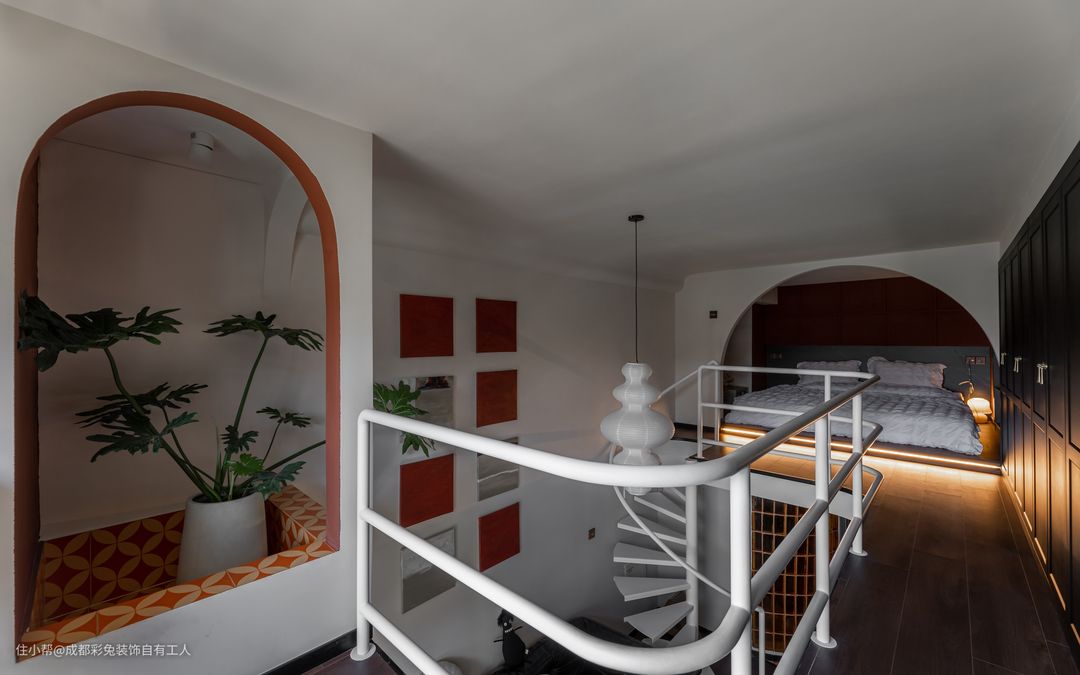 床头奶油蘑菇台灯与床尾的内嵌式灯带,可在任何情景下提供安静又让人安心的辅助照明,同时金黄色的光线和楼下亮橘色钻石玻璃、瓷砖相呼应,仿若上下两层统一,彰显屋主个性的同时富有艺术感。