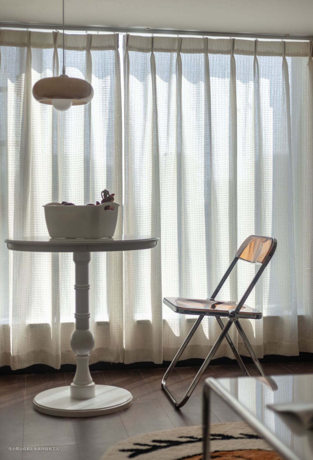 亚克力茶几与桌椅乍看有些杂乱,但本身分量感恰到好处,分区域安置在可视觉上制造出无秩序的随意美感。