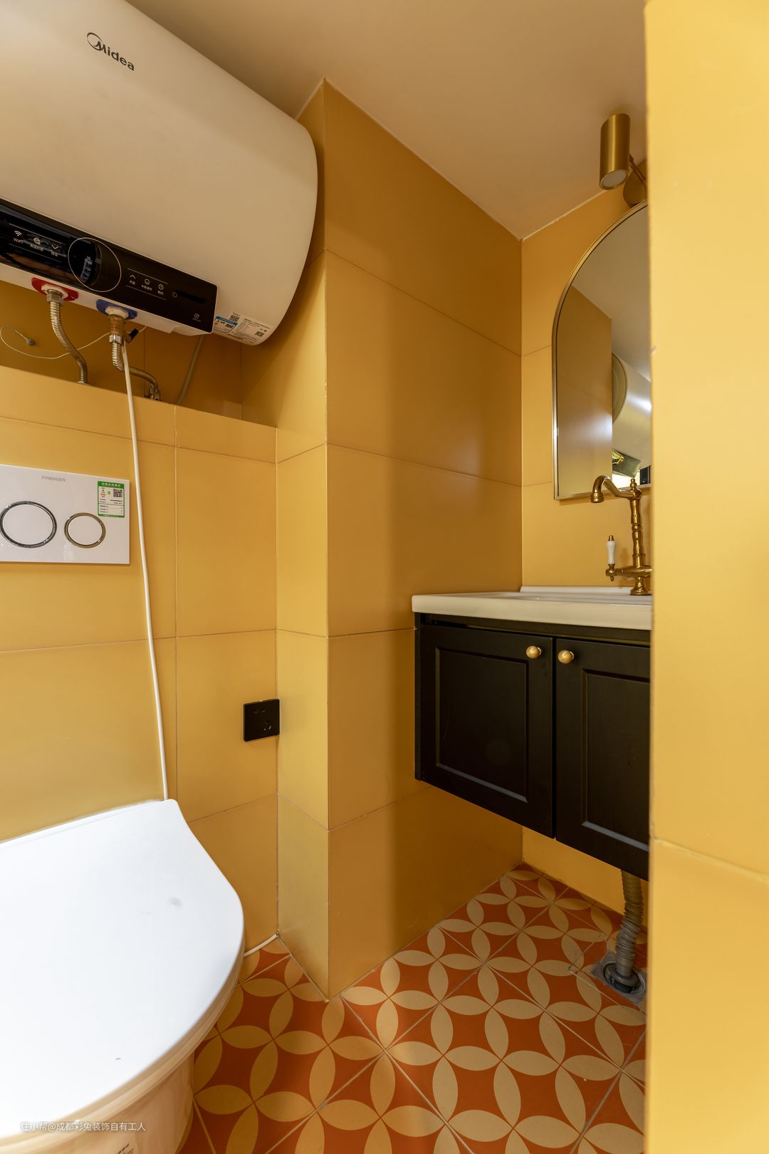长虹玻璃、橘色满天星小砖延续入户的张扬,色彩、风格统一,加上功能性上的一系列细节,使得现代与华贵融合,毕竟给猫猫洗澡也要有仪式感。