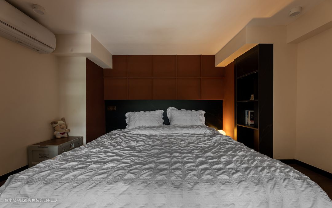 棕色、金黄色与黑巧克力色的卧室搭配,简单有力,衬托出如云朵般舒适的大床,营造舒适、安静、档次的睡眠氛围。