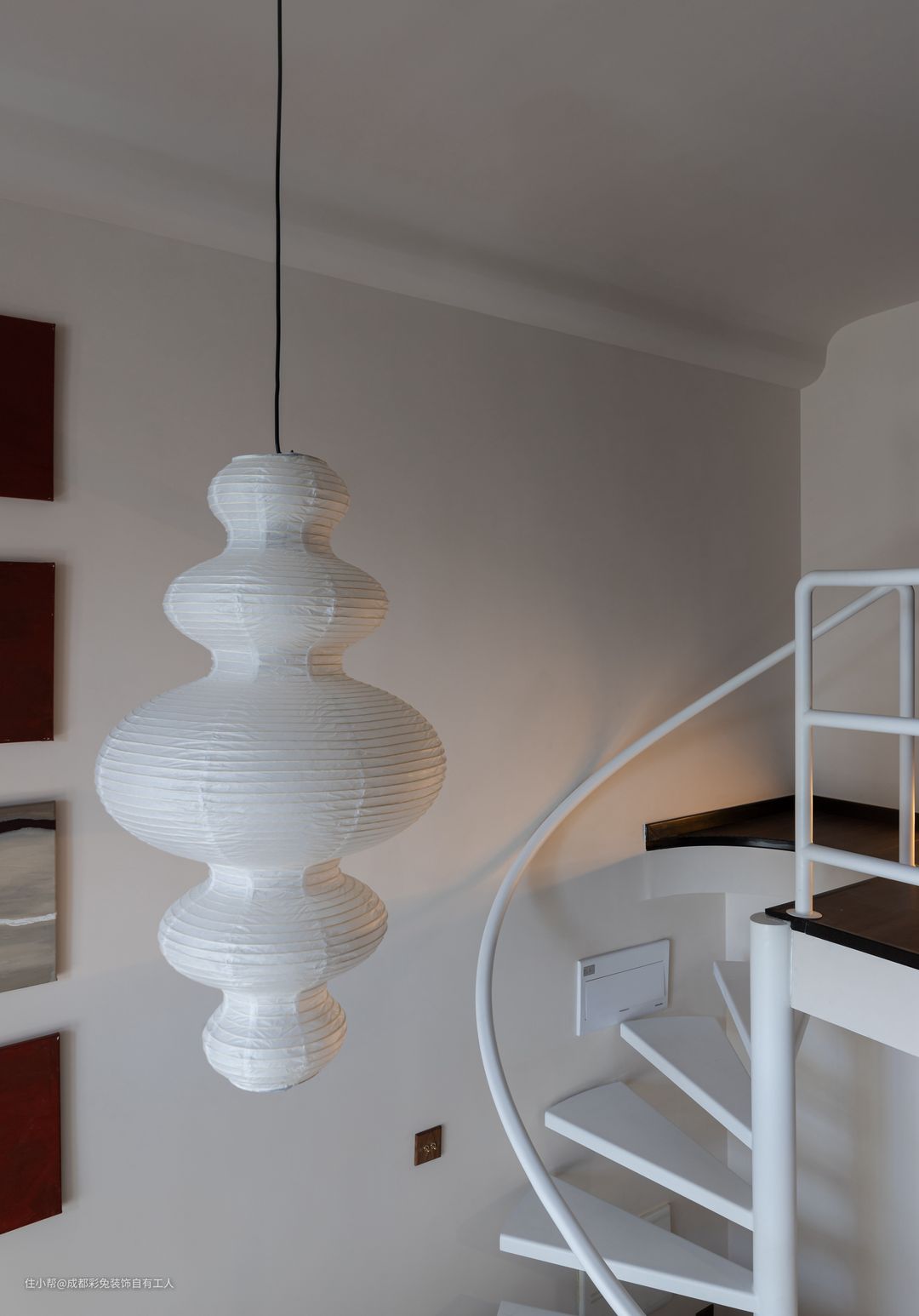 通往二楼的旋转式白色楼梯,整体弧形设计,利用垂直空间,打造空间立体感,有客人来访时能更好的保护女主人的隐私。