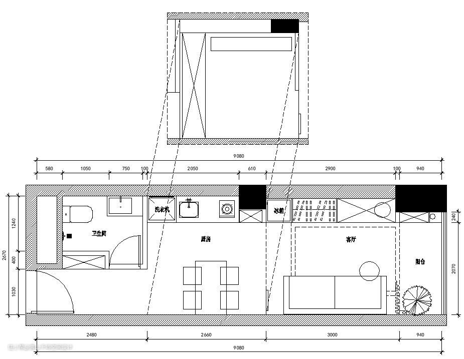 户型套内面积只有23平方米,层高2.94米,户主为一对90后的年轻夫妻,不想做太大的改动,但是希望可以有阳台,客厅,餐厅,大鞋柜,厨房,梳妆台,独立卫生间,独立卧室,大收纳等。看怎么设计可以满足这些所有的要求。