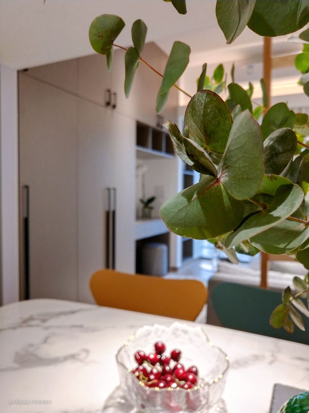 仿大理石台面餐桌,经济美观,性价比高。搭配黄色与绿的餐椅,与客厅抱枕颜色相呼应,简简单单的一屋两人三餐四季的温馨生活。
