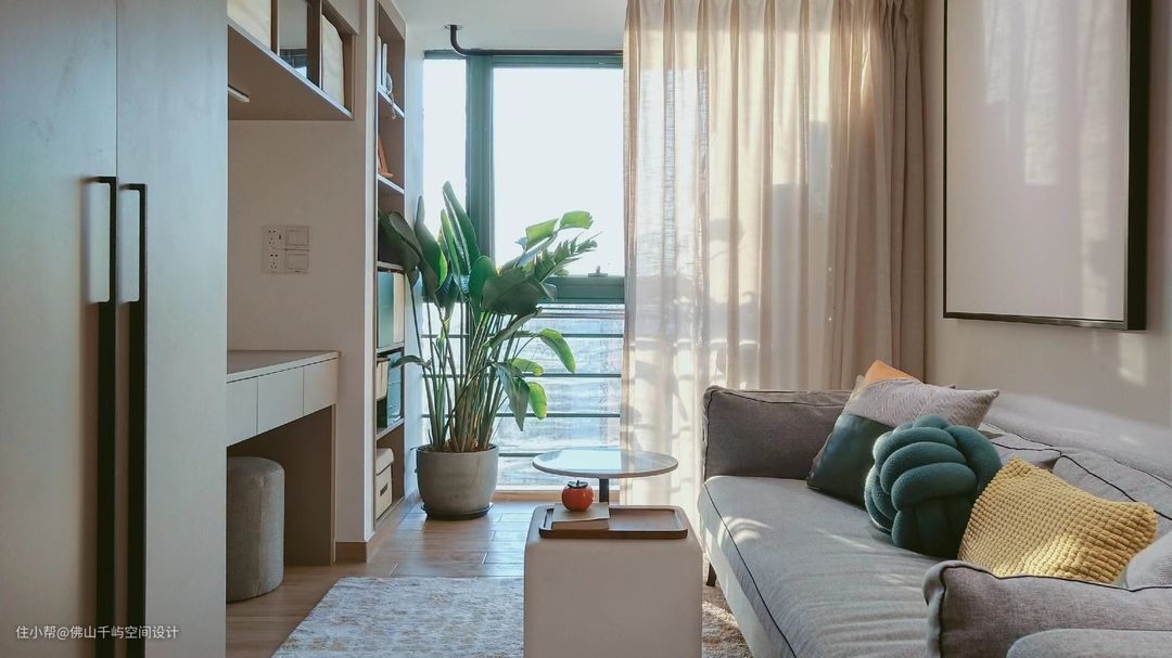 客厅增加一个到顶衣柜,放衣服,放杂物都可以,旁边是一个梳妆台,可以梳妆可办公,可放上Ipad追追剧,一举多得👍。阳台做了到顶收纳柜,拖把,洗衣用品不怕没地方放了,整整洁洁的放柜子里,放上一盆绿植,生意盎然。