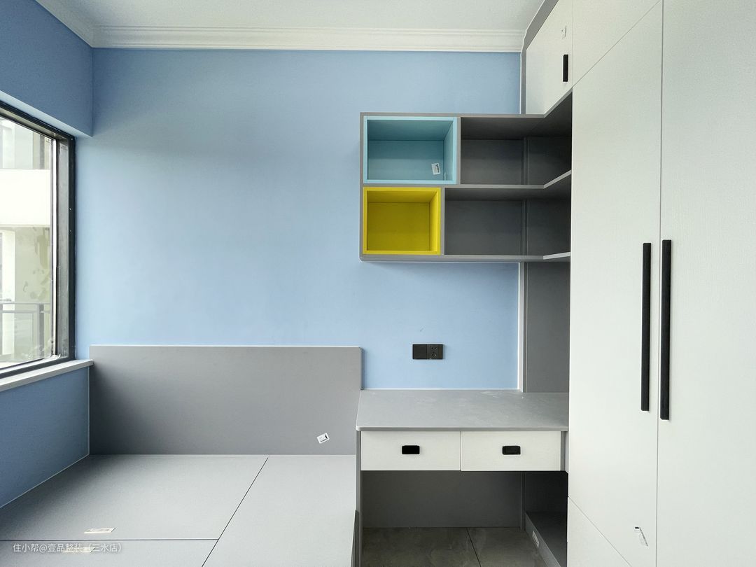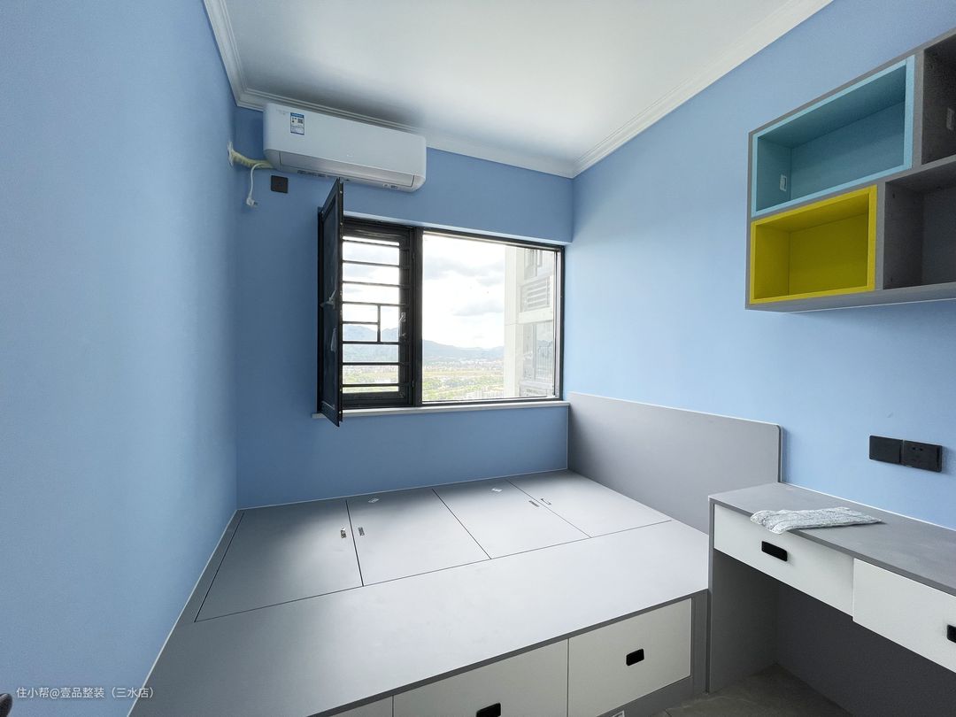 次卧做儿童房,靠窗做榻榻米,整个床身做收纳空间,存放过季棉被棉衣等,提供充足的收纳空间。