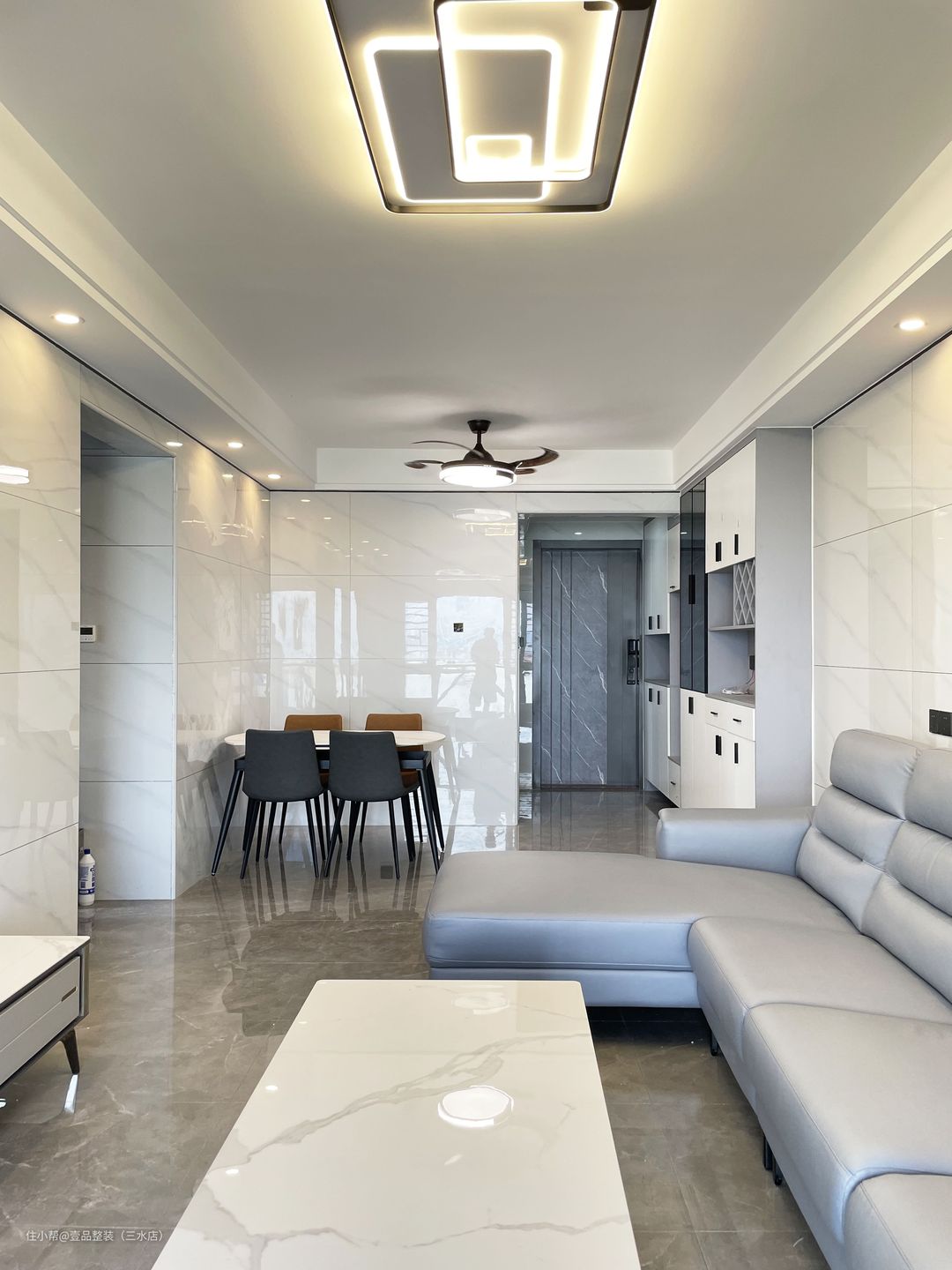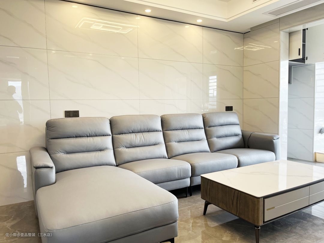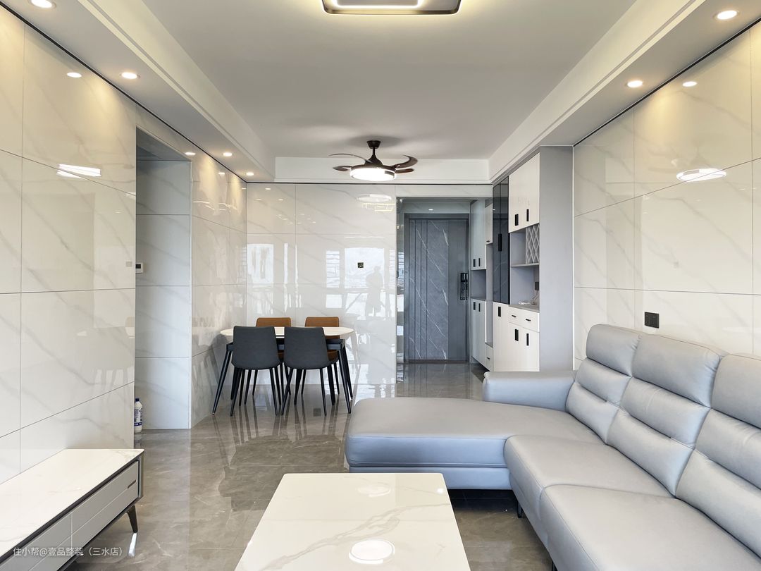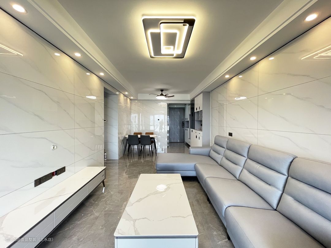 客厅做双眼皮吊顶+筒灯设计,灯光错落有致,墙面满铺400*800瓷砖,对缝细节视觉上延伸空间,起扩大空间作用。
