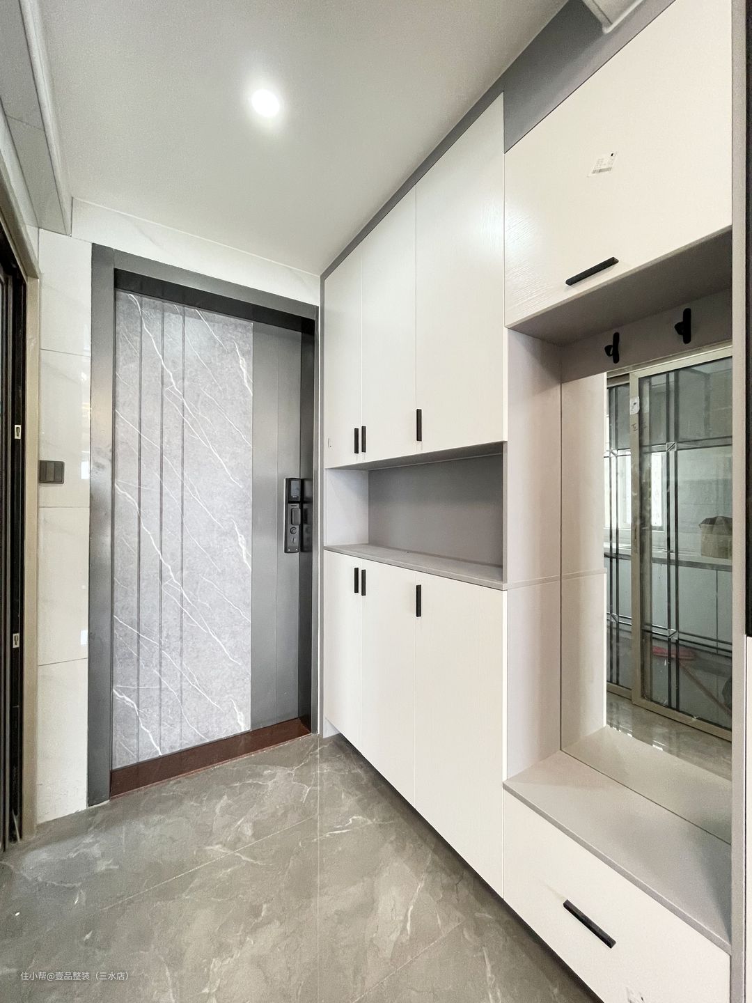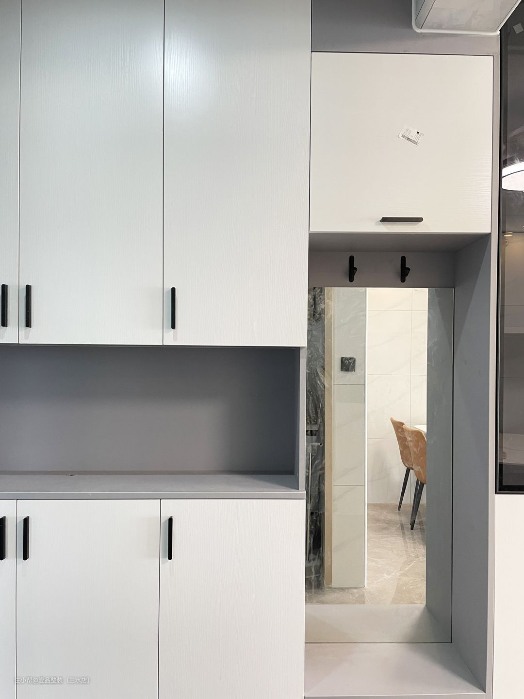 梁下位置做分段区间,中间安装镜子以及挂钩挂放大衣、雨伞或钥匙。#玄关镜#玄关柜