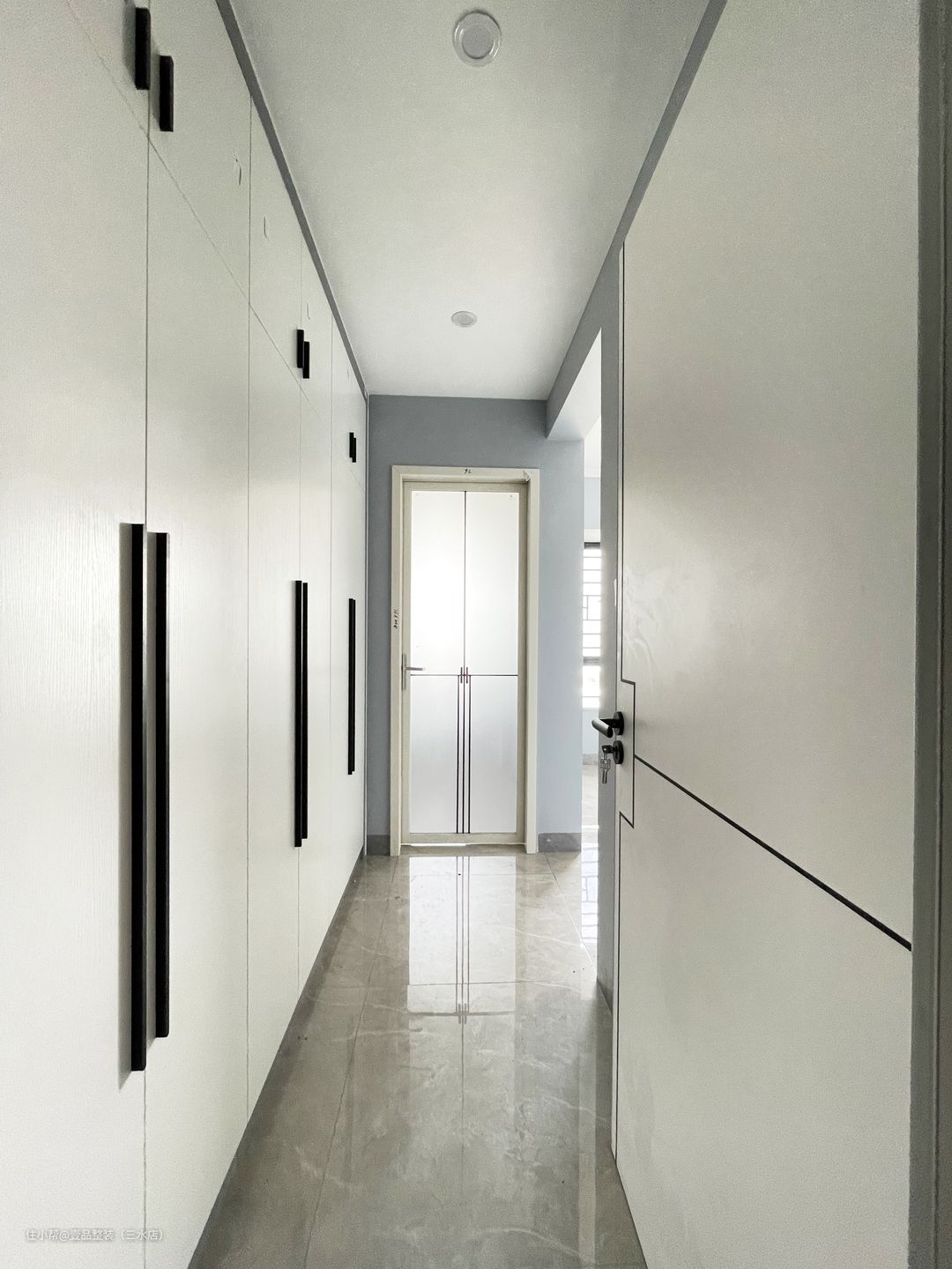 主卧进门左手边做整排到顶大衣柜,满足一年四季的存储需求。白色面板上安装黑色长条把手,简洁大气更有质感。