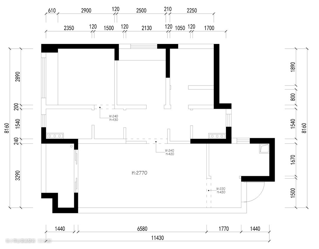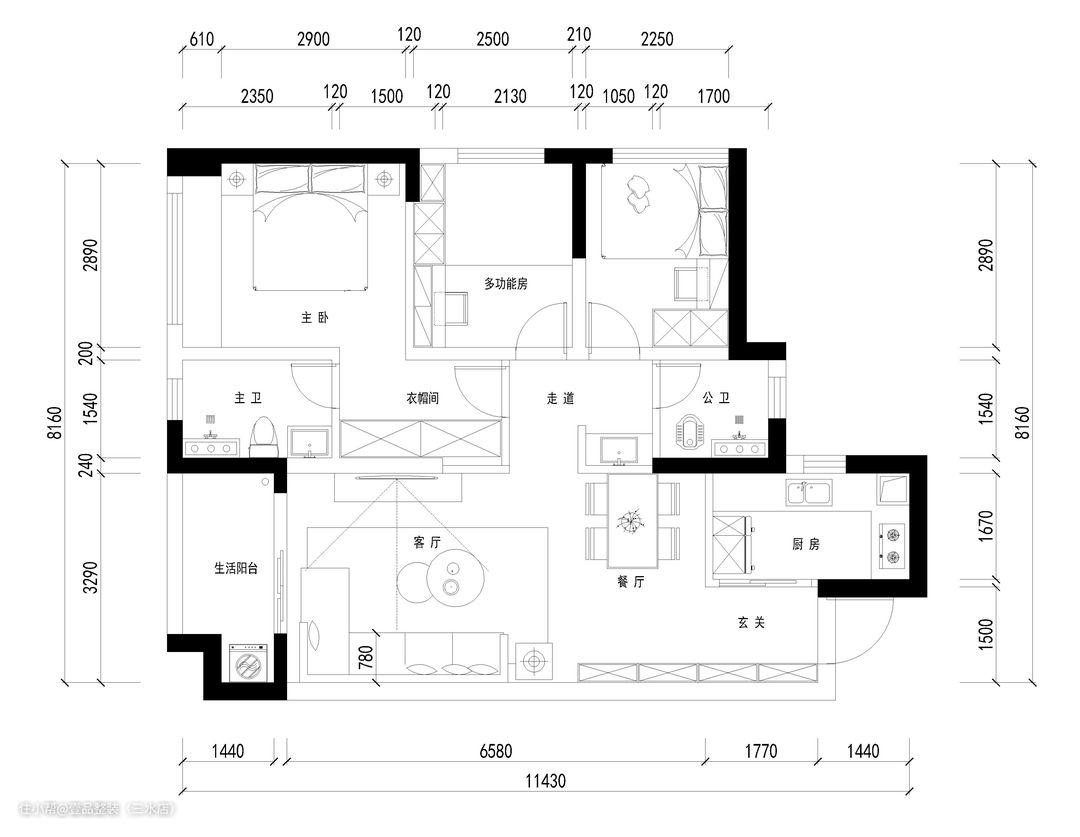 原始户型分析: (1)原户型动静分区明显,休息区与客餐厅活动区分为上下两部分,两空间互不影响,保证休息者的睡眠质量。 (2)单阳台户型只能用做生活阳台或休闲+生活混搭使用,不能单独作为休闲阳台,保留晾晒区域 (3)周正户型,格局分布明确适当,能有效提高空间利用率。