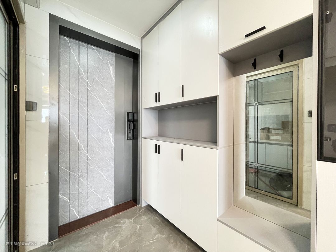 进门左手边安装定制一体柜,玄关柜下方留空15公分放置室内替换鞋,避免回家时将泥沙带入鞋柜里面增加清理难度。