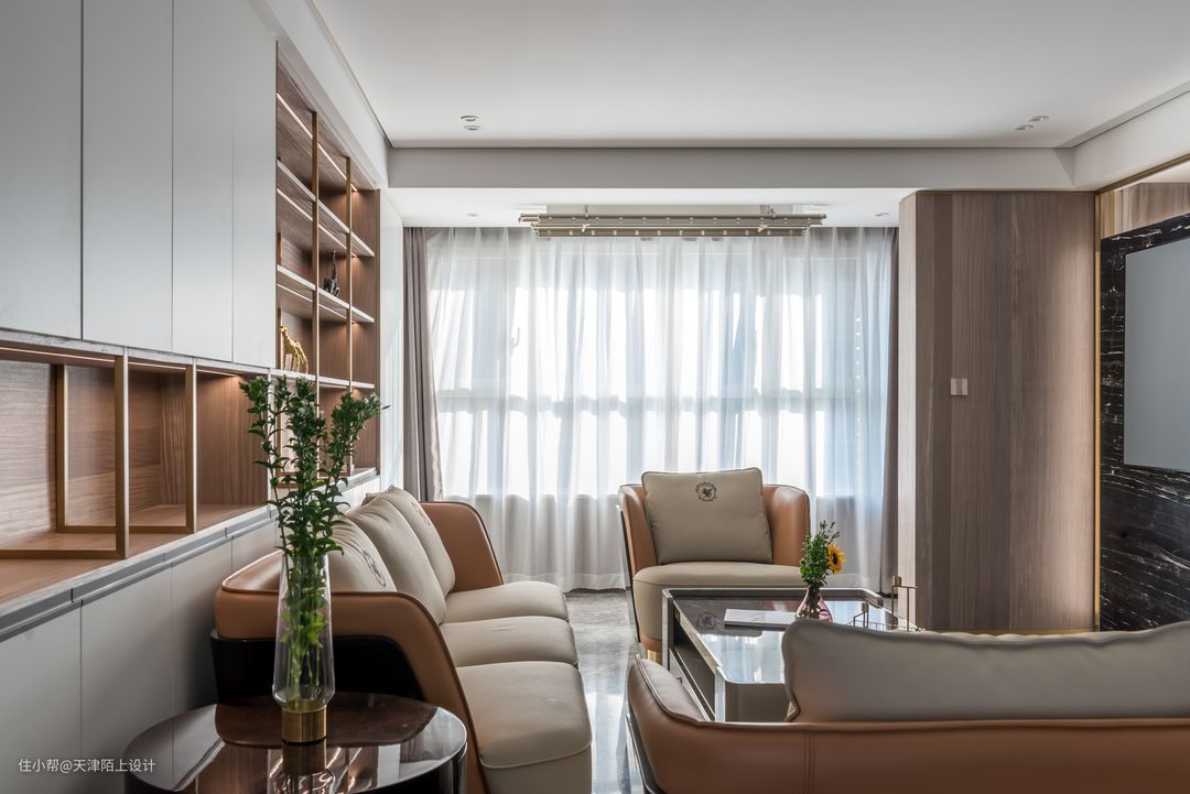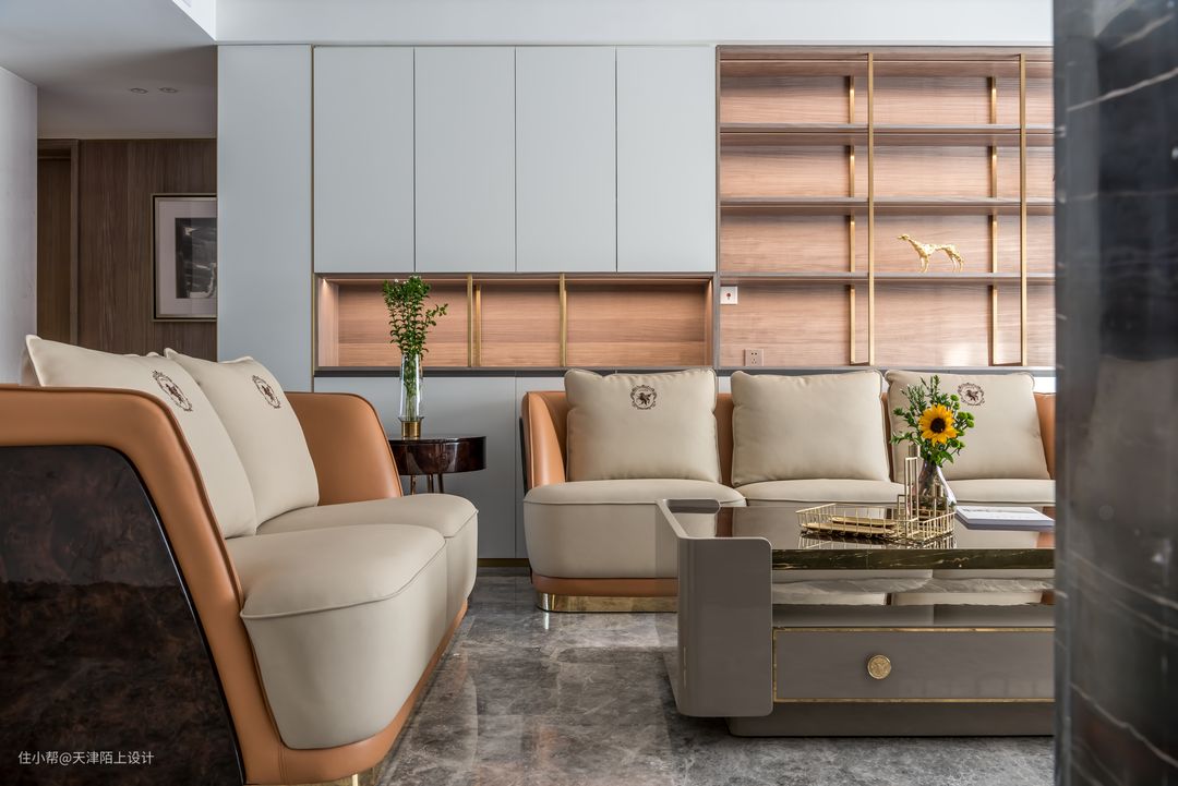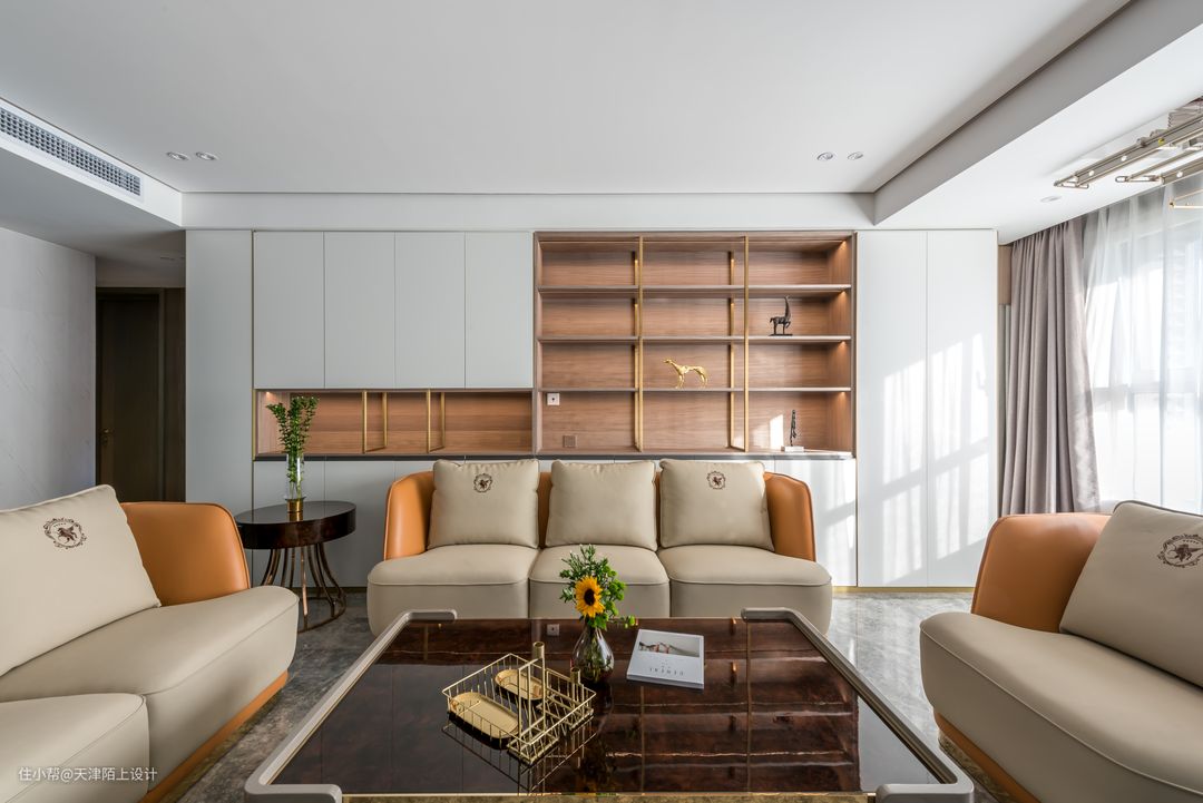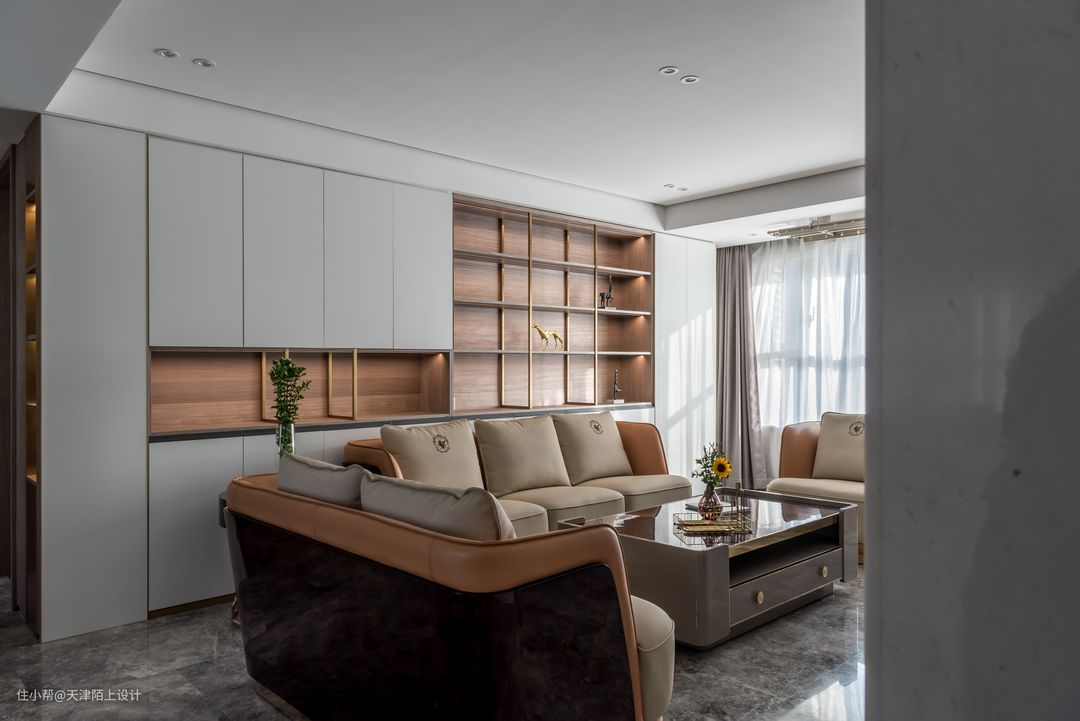 本案业主是一位房地产老总40岁左右成功人士,有一妻一儿一女,此套住宅是因离老人近,为方便照顾而购置的三室两厅居所。儿子13岁住在次卧,由于次卧方正,摆放成品家具很难满足业主对于大床,大衣柜,长写字桌的功能需求,所以选择定制家具来实现,女儿三岁刚上幼儿园目前和业主一起居住,所以男主最后留了一间独立的书房,方便办公阅读使用。 由于业主需要一个很大展示空间,所以设计师在设计上打掉了阳台的非承重墙,通过金属和木饰面打造了整面墙的展示柜,洗衣机挪至阳台的承重墙部位,通过隐形门处理和电视墙左边的木饰面融为一体,阳台吊顶内嵌升降衣架,洗晾一体,非常方便。 而在整体风格上由客户喜欢的现代轻奢家具倒推硬装,主要运用木饰面,金属,大理石来打造整体硬装空间,这样的设计思路统一性更强,落地效果更好。