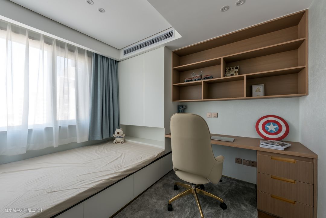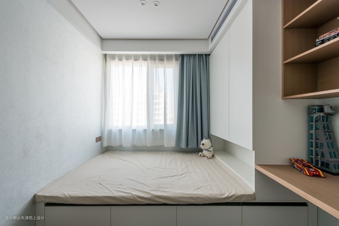 方正的次卧通过定制榻榻米实现休息、阅读、储物等功能,相较于整案的奢华精致,内敛与质朴更适合儿子的房间