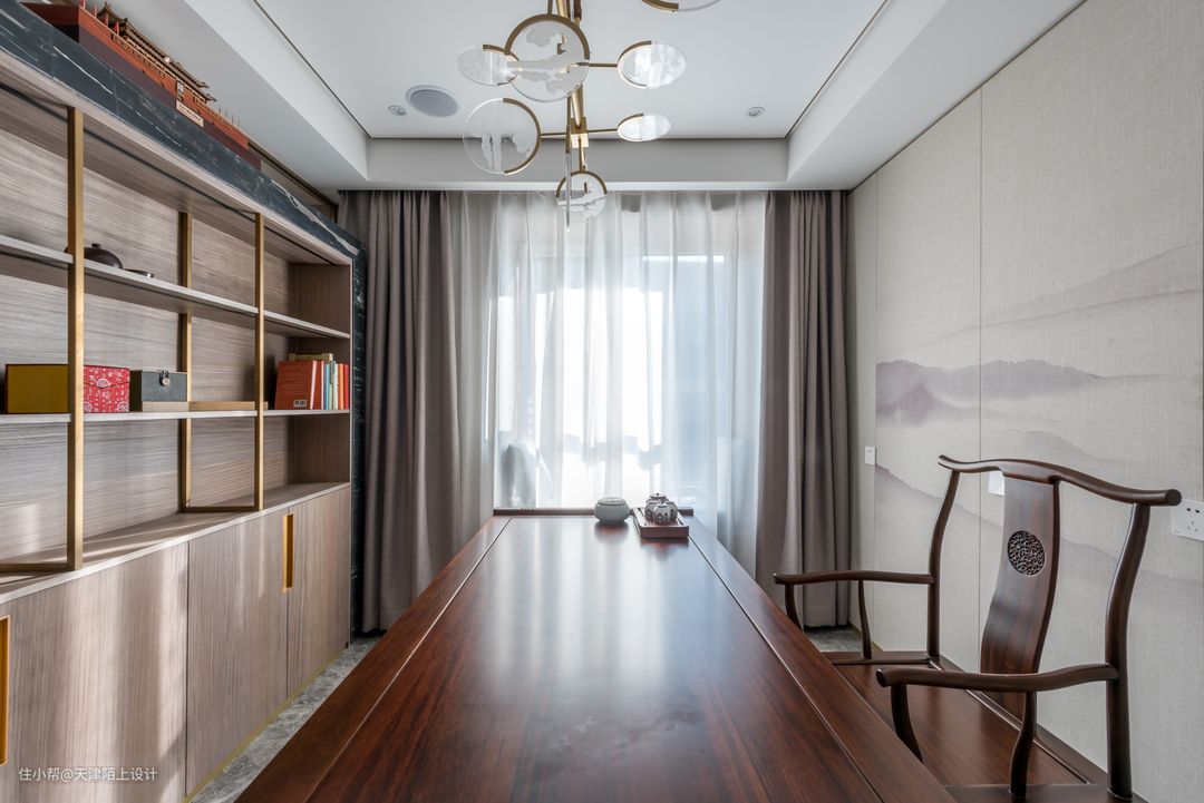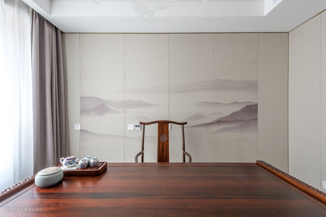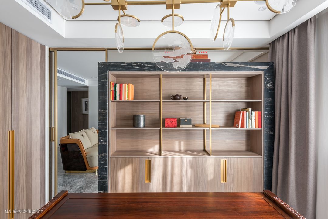 实木的书桌椅与山水元素,略带中式风格的书房是刻在业主骨子里的情怀,利用客厅电视墙背面石材打造的书柜,灵活运用了既有元素,也让书房别具风格