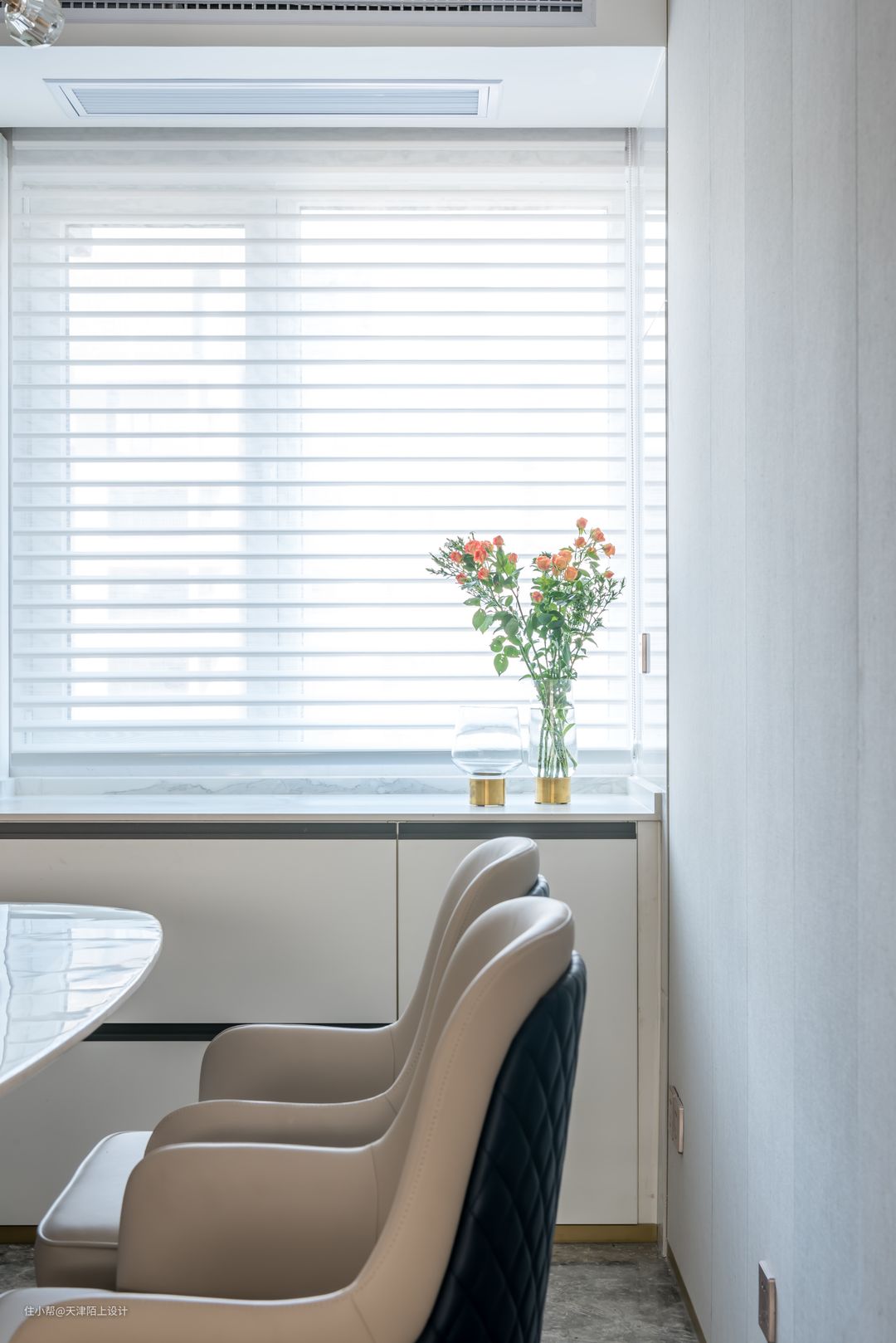 细长的餐厅在窗户处增加了储物柜和备餐柜,提高餐厅功能性的同时也缓解了厨房的储物压力,与窗边平齐的餐边柜也不会影响整体采光,同系列的艾伦斯特餐厅家具和客厅家具形成很好的统一协调