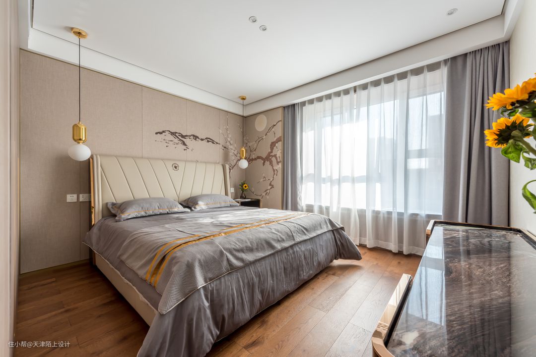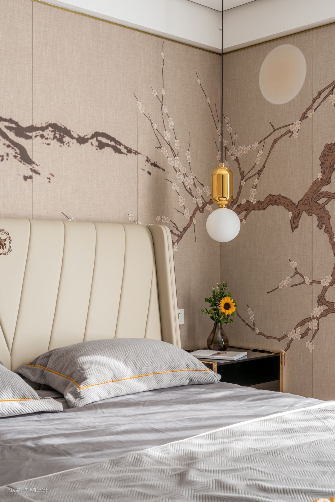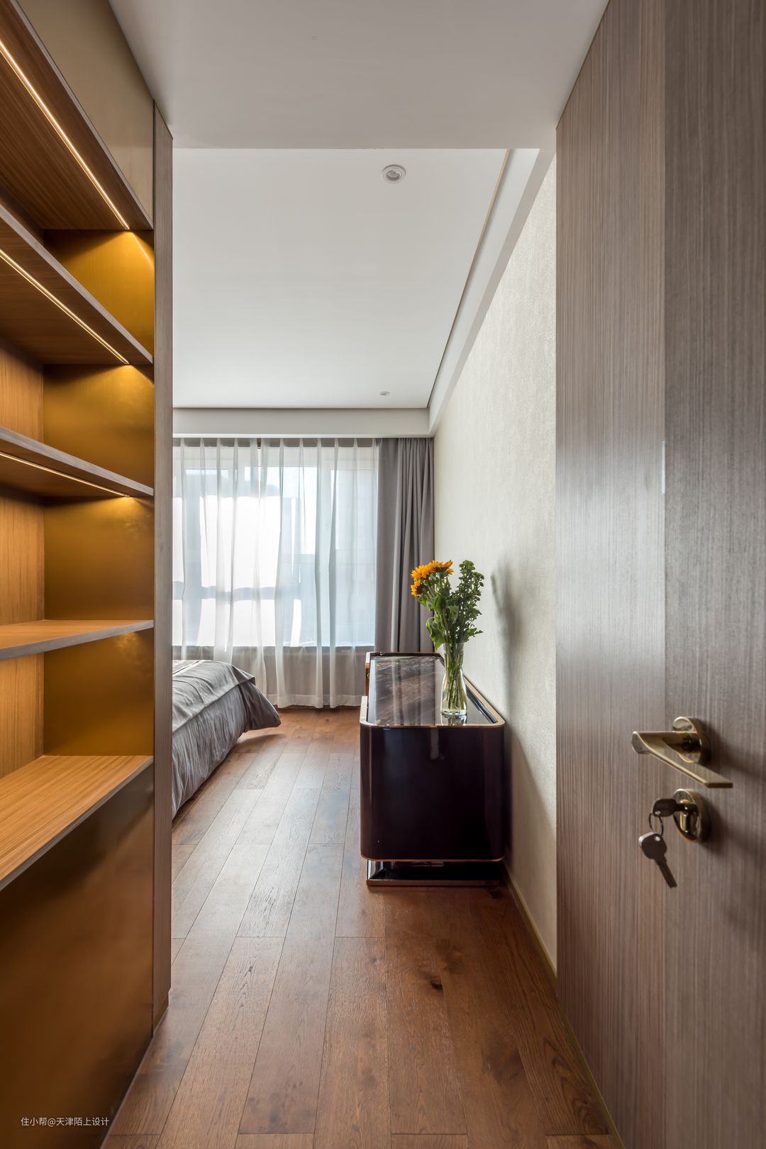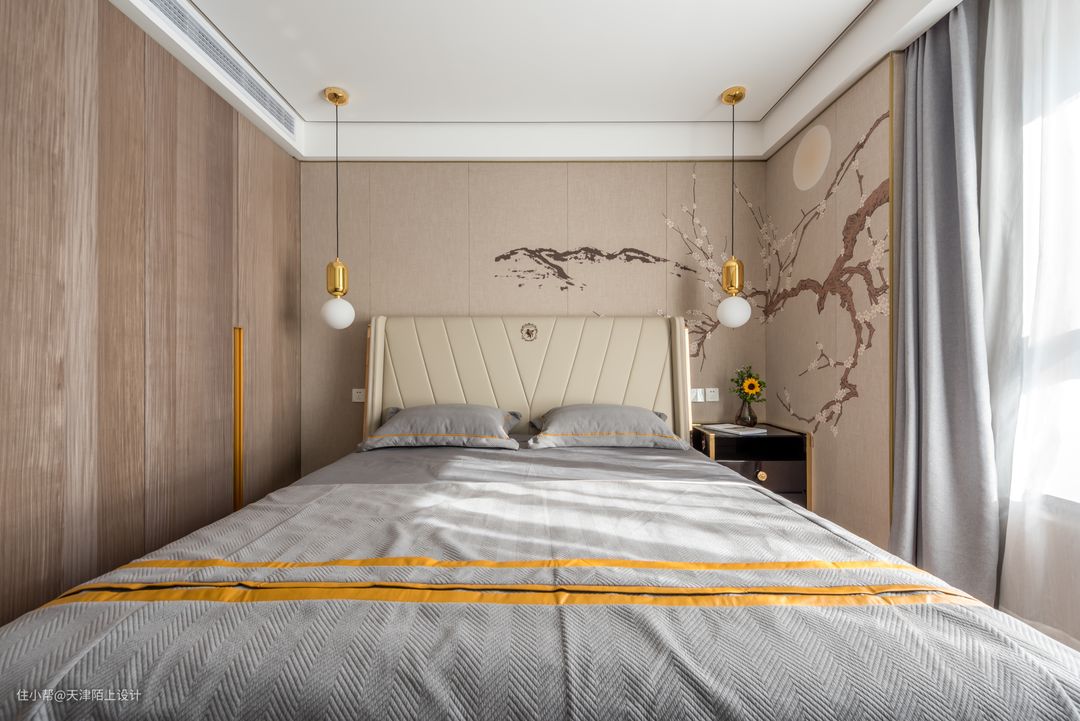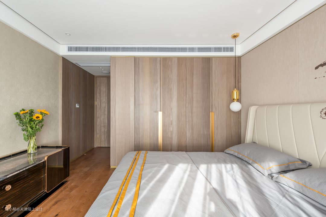 主卧背景墙的L型处理,区别于传统的硬包壁画,视觉上提升了卧室的宽度,定制的木饰面衣柜未做石膏板隔墙处理,而在侧面增加了独立的展示柜,充分利用每一寸空间,空间的木饰面与点点的金属元素相搭配,维持了整案基调却又不会过分张扬