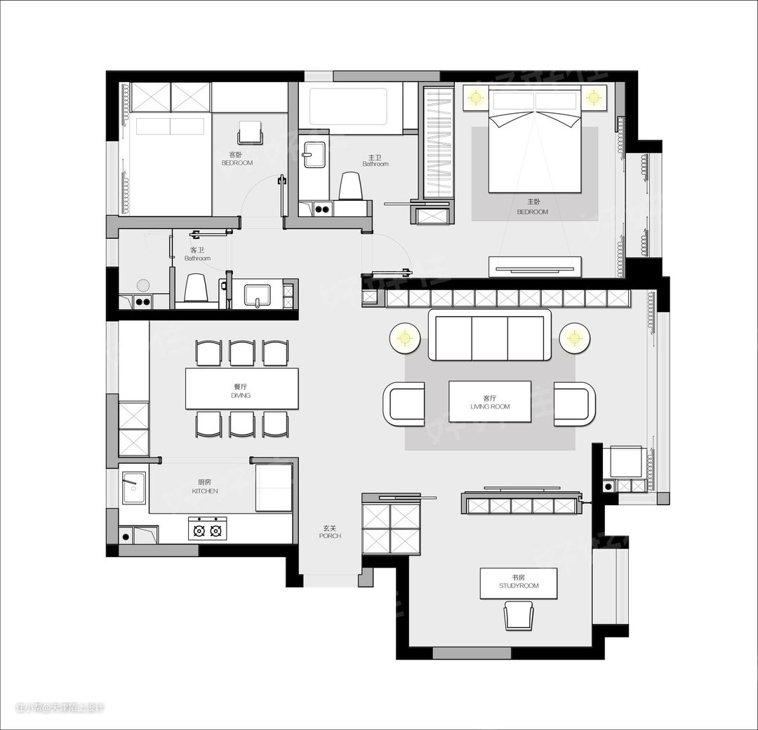 平面方案 1. 将主卧原有的衣帽间墙体拆除,扩大原有卫生间,成功放置1.7米椭圆缸,2米长的定制衣帽柜 2. 将入户与厨房的墙体打通,扩大原厨房的面积,双门冰箱,水槽洗碗机,集成一体灶,被妥妥安置 3. 改变书房的门口位置,将原有书房门口做成双面储物柜,一面作为进门衣帽柜使用,一面作为书房储物柜使用,书房入口设计成内嵌推拉门既可敞开和客厅融为一体,又可封闭做单独安静书房使用