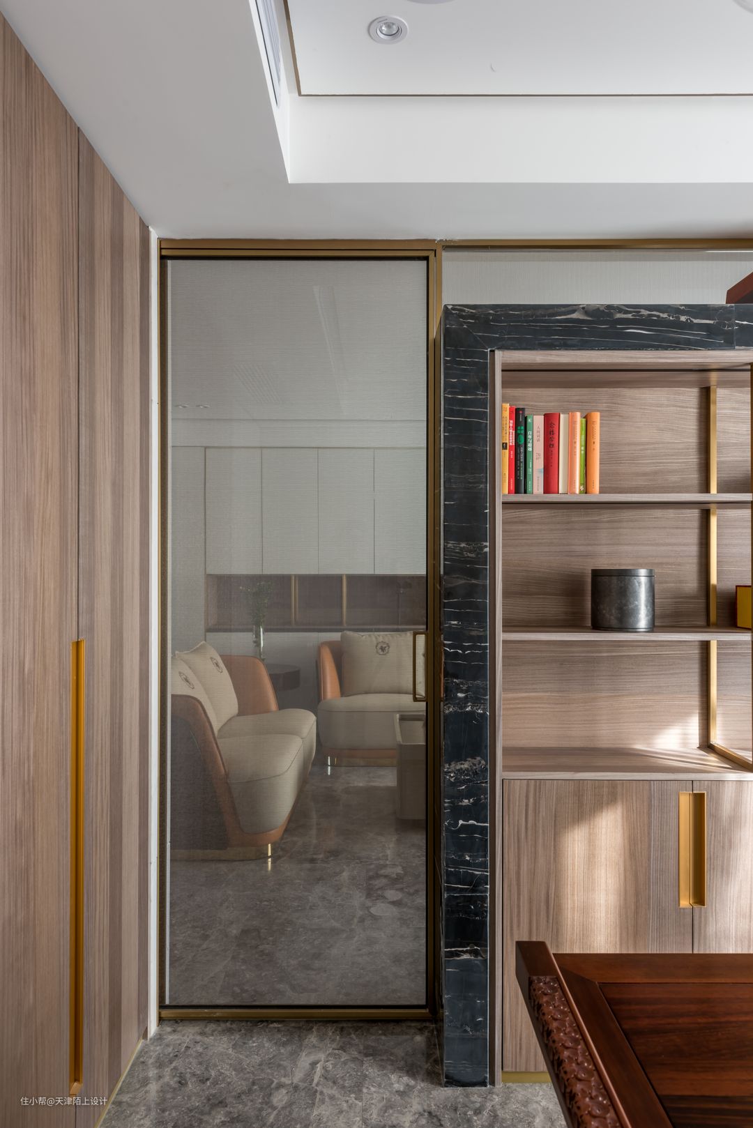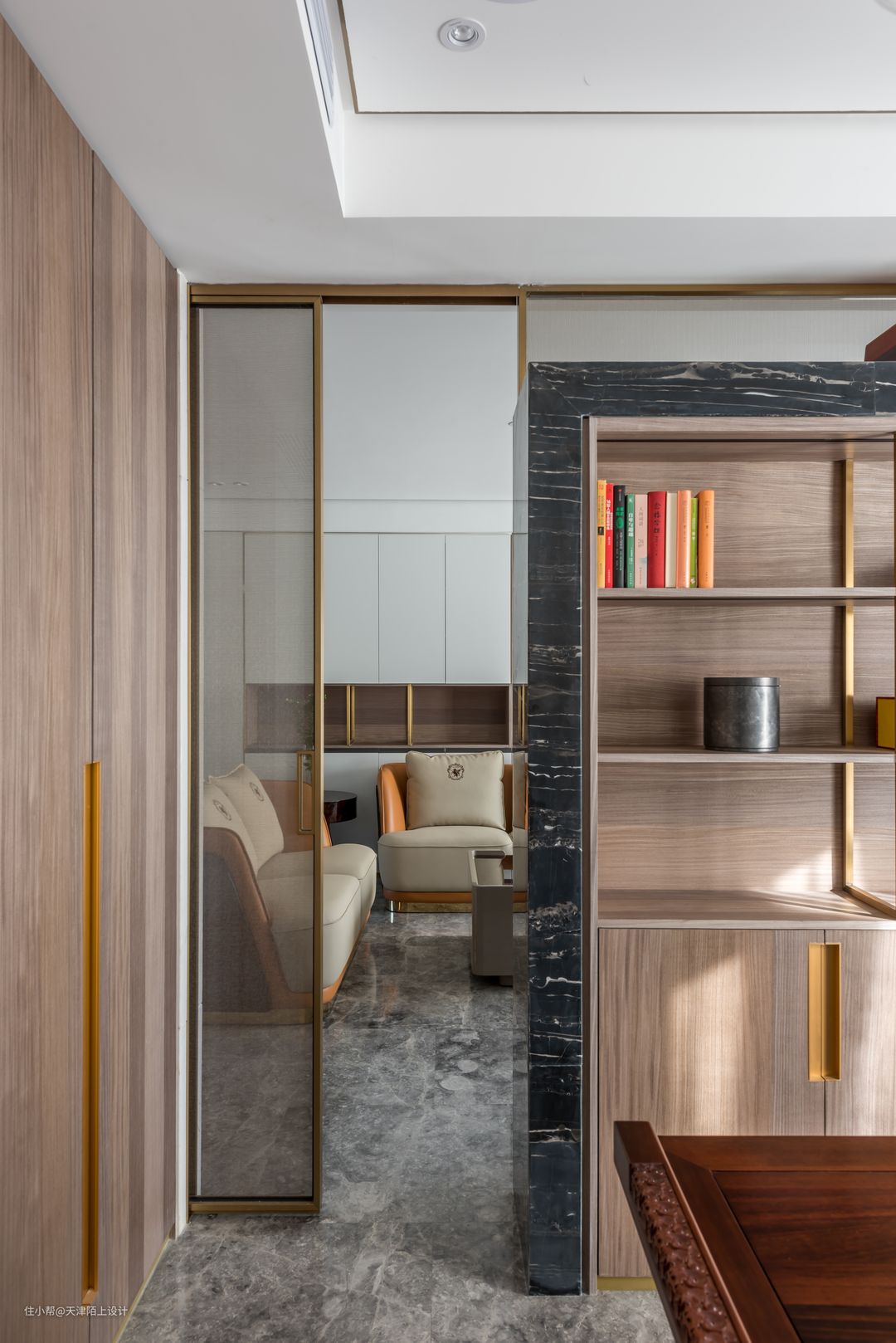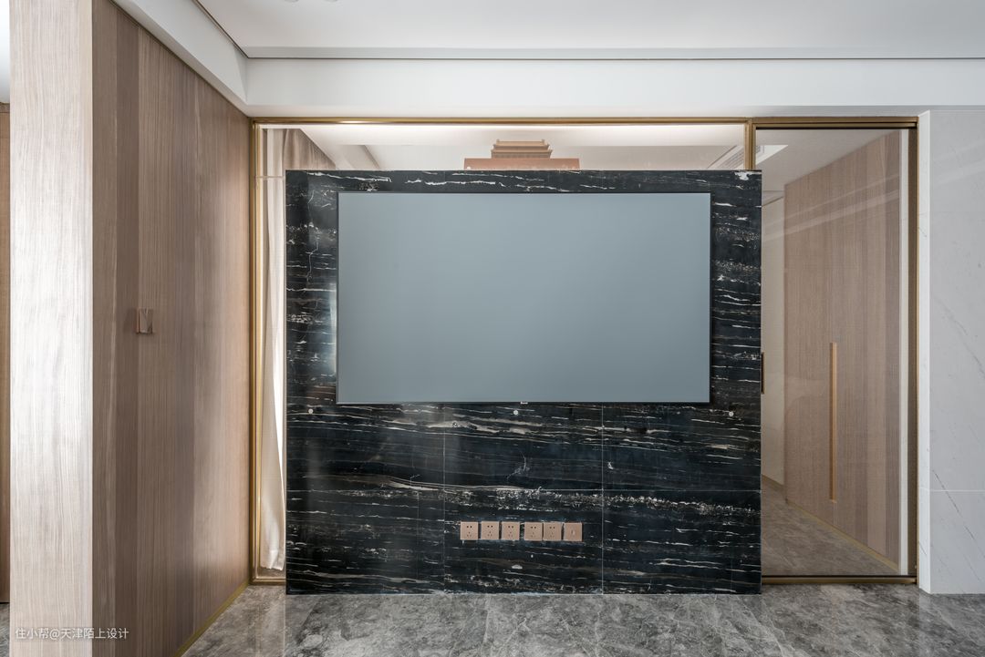 整块石材既作为了电视墙/书柜,也巧妙的分隔开了客厅与书房两个功能区,夹丝玻璃门内嵌推拉的设计,也为空间增加了互动性与美观