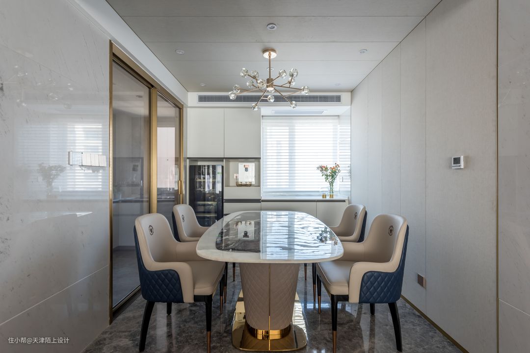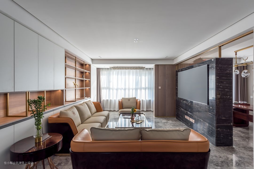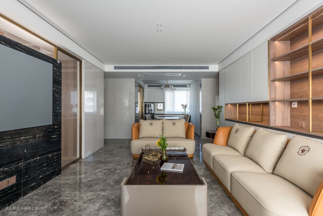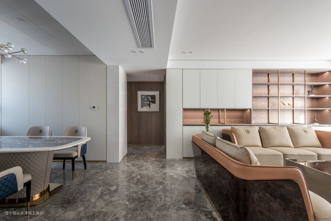 无主灯设计,天然石的地面,整块石材打造的电视墙,客厅空间没有冗余的装饰,奢华却又不落俗,尺度拿捏的刚好;金属和木质的组合,光与影在空间的流动,都像是在上演关于轻奢的绝美交响