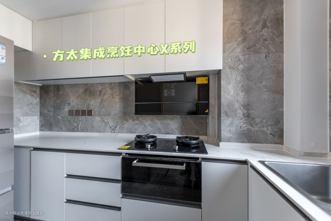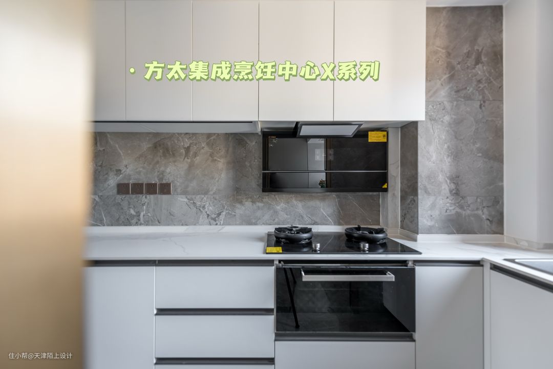 业主一家的用餐习惯偏向于传统的中式爆炒,所以可开放可封闭的中厨搭配吸油烟功能超级优秀的厨电产品是最佳方案。 经过长期的挑选对比,最终选择了方太的集成烹饪中心X系列,不同于集成灶,作为一款将吸油烟、灶蒸烤烹饪等功能全部集成的高端厨电产品,它满足了业主对于下厨的所有需求。 灵活自由的安装方式是女主人钟意的特点之一,无需破坏公共烟道,在嵌入柜体安装后,将产品巧妙地融入厨房,黑色的镜面设计搭配白色橱柜,时尚又美观; 在特有的云腾智驱引擎加持下,油烟机能够保证在大风量吸油烟的同时还可以实现低噪音,宽域拢烟配上超薄低吸设计,哪怕在猛火爆炒的环境下也可以做到不跑烟;智能巡航技术,可实时检测烟道阻力调整风量,保证时刻都有好的排烟效果,同时这款产品还具备流量智能分配功能,可自由控制左右吸力,一侧爆炒用强风,一侧煲汤用弱风,风力按情况合理分配,烹饪体验更为人性化。