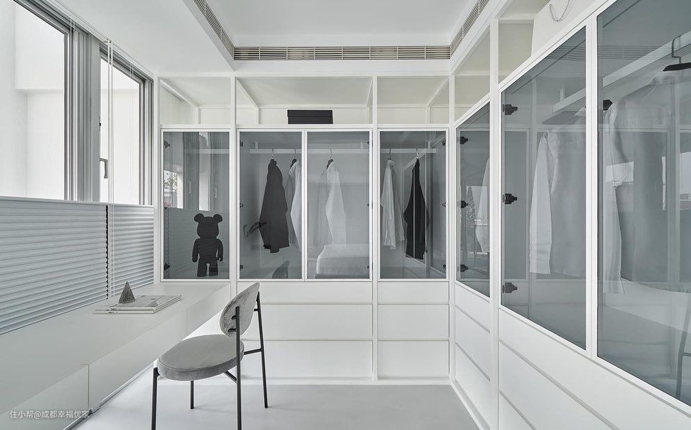 衣帽间中做了L型顶天立地大衣柜,收纳效果超级好,相信屋主再也不用烦恼衣服放不下了。衣柜上大量运用了玻璃门,具有强烈的展示效果。但有一点,就是柜子顶部打造成了开放式,可能需要经常清理灰尘。 梳妆台正对窗户安装,保证了化妆护肤时充足的自然光,梳妆台做了最近流行的悬挂式造型,无卫生死角还时尚美观有轻盈感。